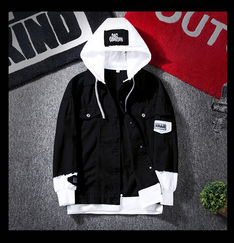 メンズデニムジャケット 韓国風 学生 ゆったり トレンド ダメージ加工 香港風 フェイクツーピース フード付きジャケット カジュアル 多用途
