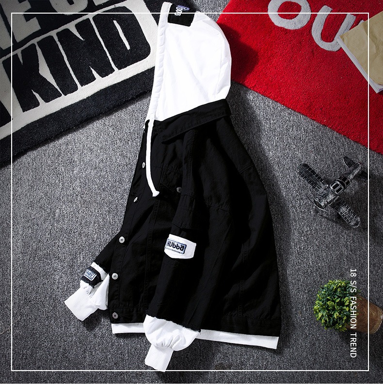 夏のフード付きデニムジャケットメンズ韓国スタイルトレンディカジュアル多用途トップス春と秋のカップル偽ツーピースジャケット