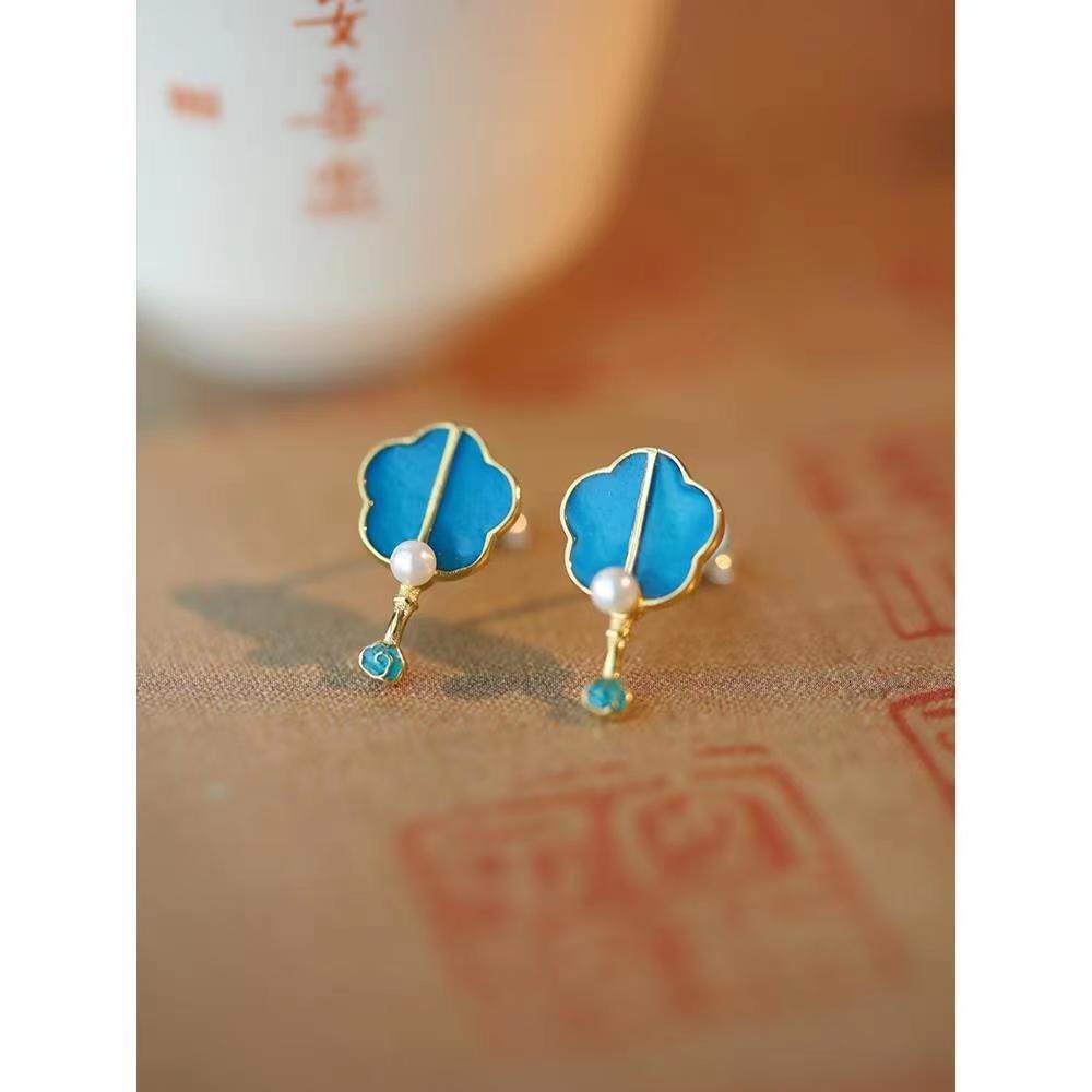 新中式古典国風「流雲小扇」エナメルパール小イヤリング 喜竹オリジナル漢服アクセサリー