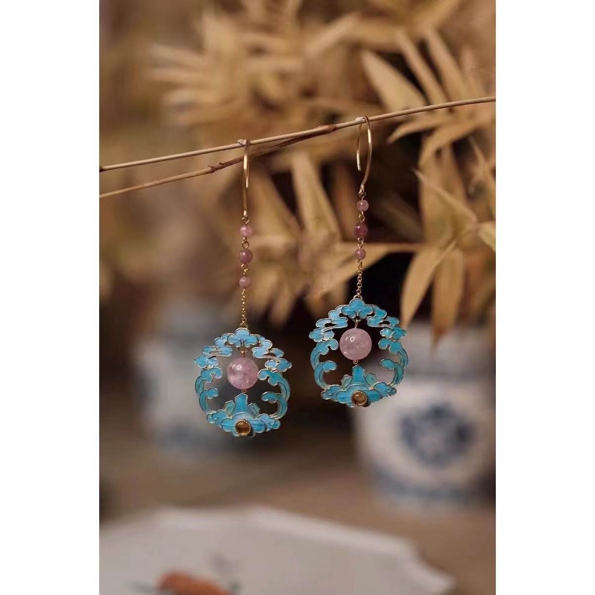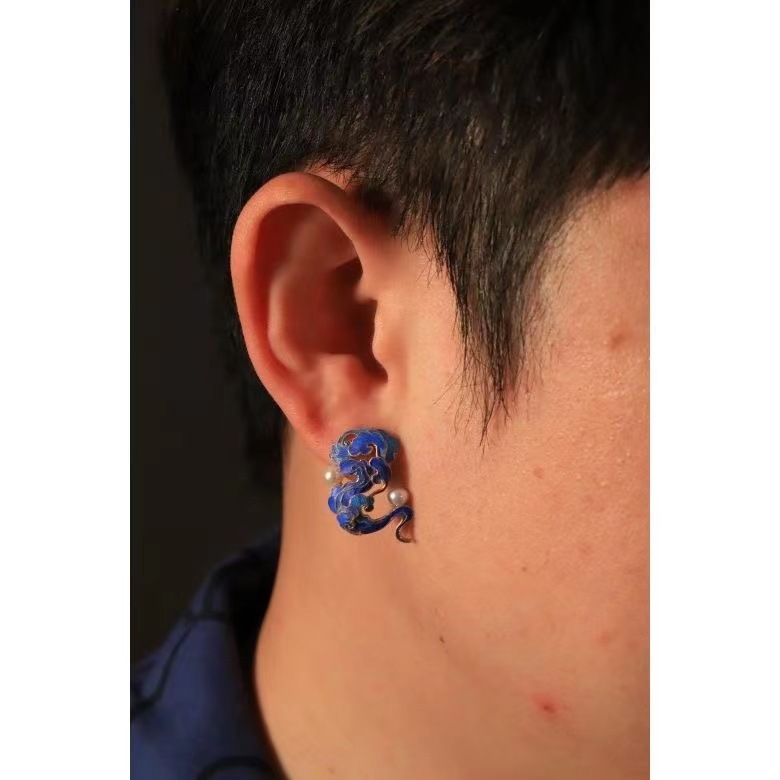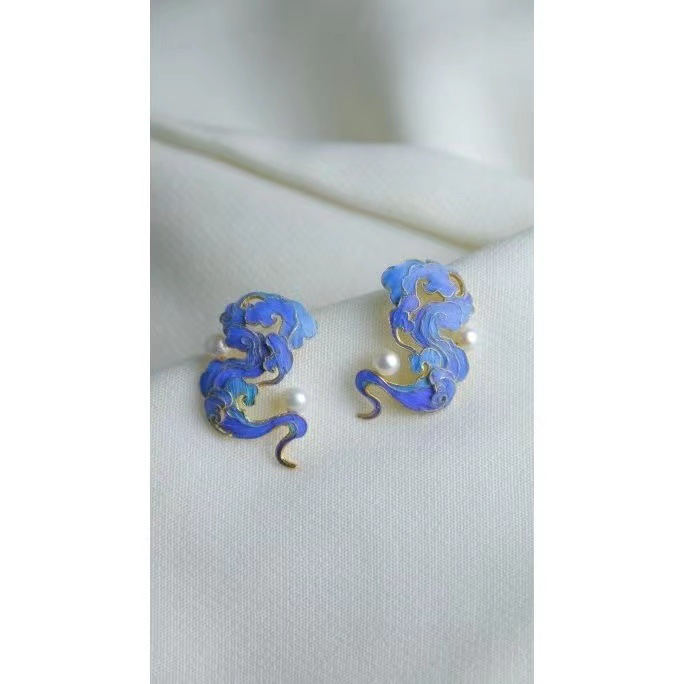 古代の青い模造点翠祥雲イヤリング女性のレトロな中国風エナメルパールイヤリング漢服チャイナドレスマッチング