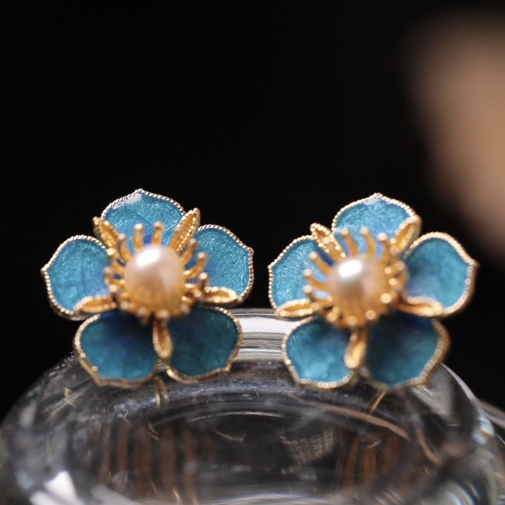 国潮模造点翠花卉真珠ピアスオリジナルデザイン花糸モザイク純銀イヤリング新製品