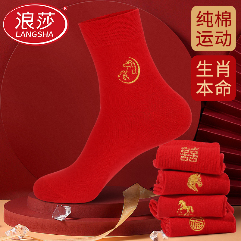 浪莎本命年靴下男性純綿中筒靴下蛇年プレゼント大赤色結婚カップル綿靴下男