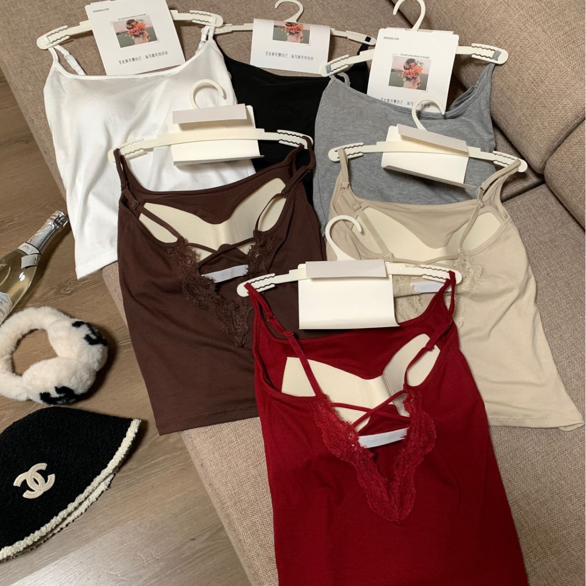 8338#春夏新款深V镂空蕾丝美背吊带背心女内穿外穿方领显瘦带胸垫
