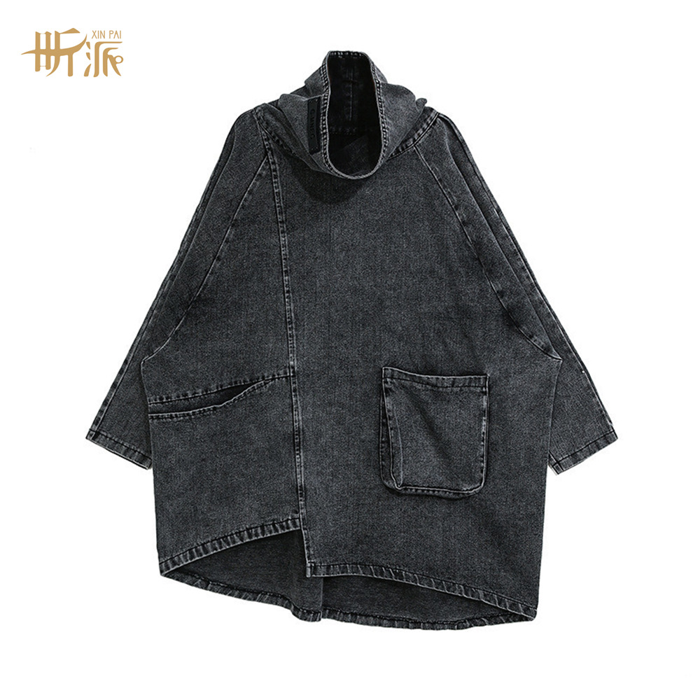 ハイネックプルオーバー不規則な黒のウォッシュデニムジャケット秋の新ダークルーズ大きいサイズカジュアルジャケット