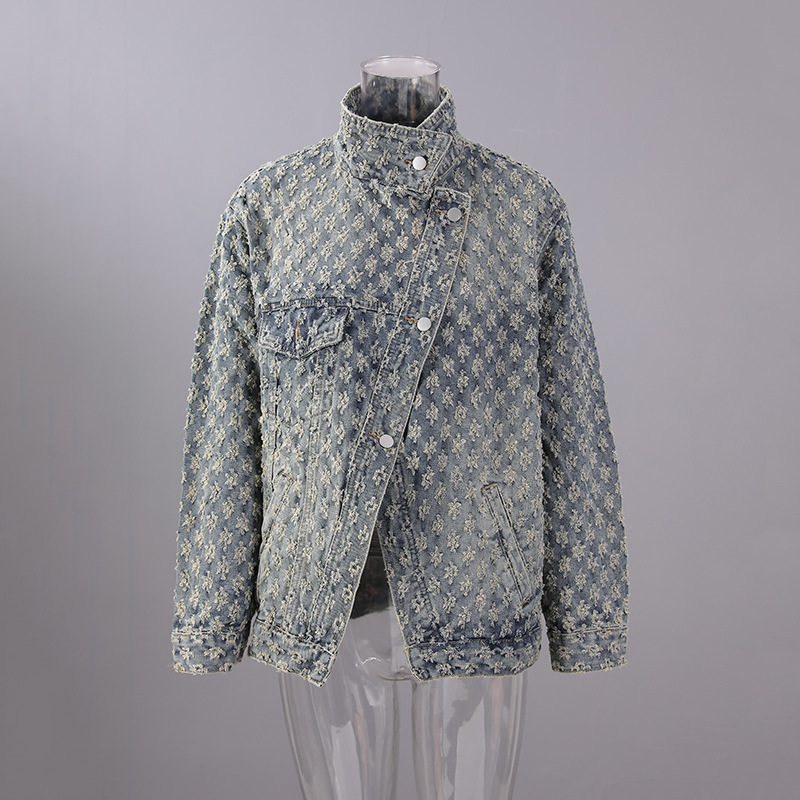 跨境亚马逊韩版不规则洗水牛仔外套宽松小众设计感短款翻领上衣女