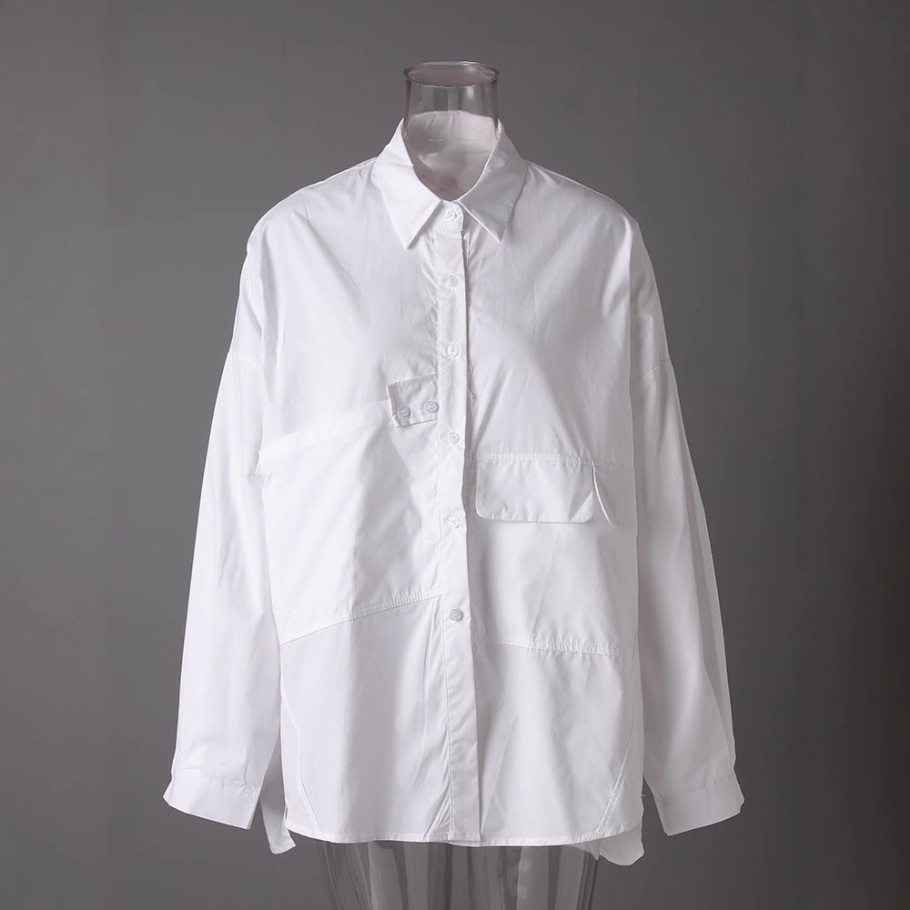 ニッチなレトロデザインの女性用白シャツ 2025 新しいミッドレングスのスプライシングポケットカジュアル不規則なシャツ