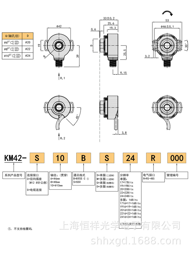 Km60光学エンコーダbiss-c/485/ssi絶対値パルスエンコーダ中空6-15mm