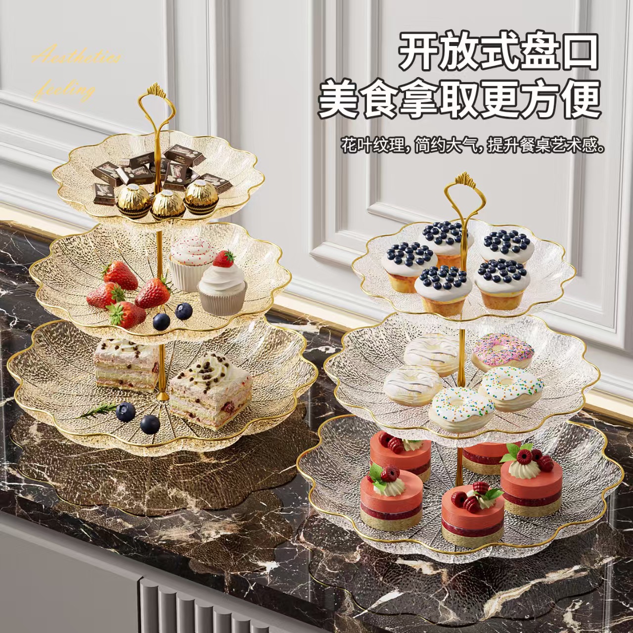 跨境优选轻奢荷叶三层水果盘创意客厅家用下午茶糖果甜品点心托盘