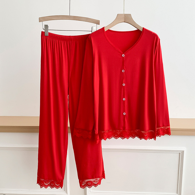 本命年秋冬新款睡衣开衫长袖长裤家居服套装蕾丝女士家居服两件套