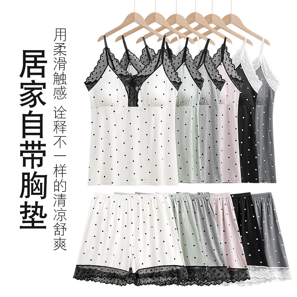 家の服のスーツのストラップのショートパンツは色のレースの波のポイントのモーダルにぶつかって胸のクッションのパジャマの女性の夏の爆発的な卸売りを持ちます。