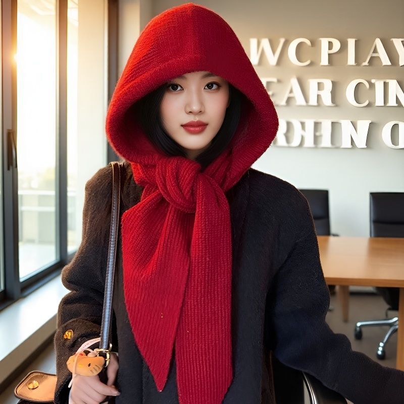 红色针织帽子围巾一体女秋冬季新年护耳连帽围脖保暖巴拉克拉法帽