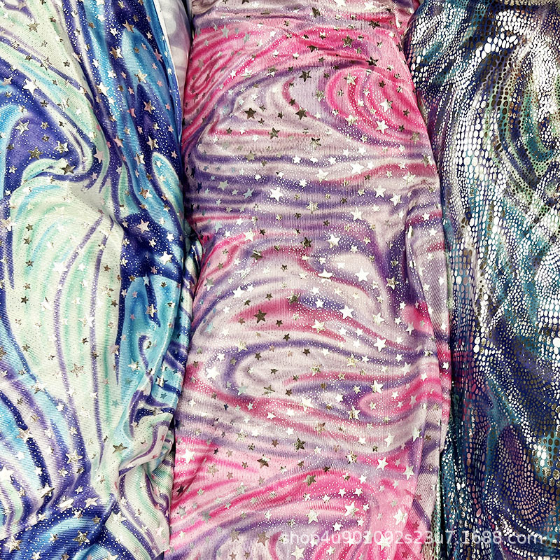 カラフルなレーザー幻彩弾力性スパンデックス生地自慢舞台演出服箔押し生地背景装飾布卸売り