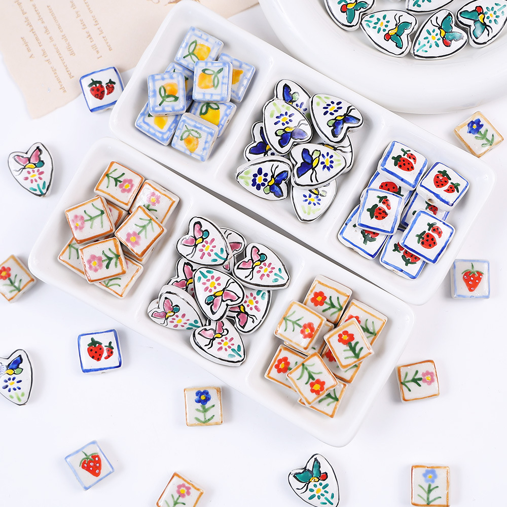 陶瓷手绘草莓爱心蝴蝶正方串珠 diy手工手链项链散珠饰品配件材料