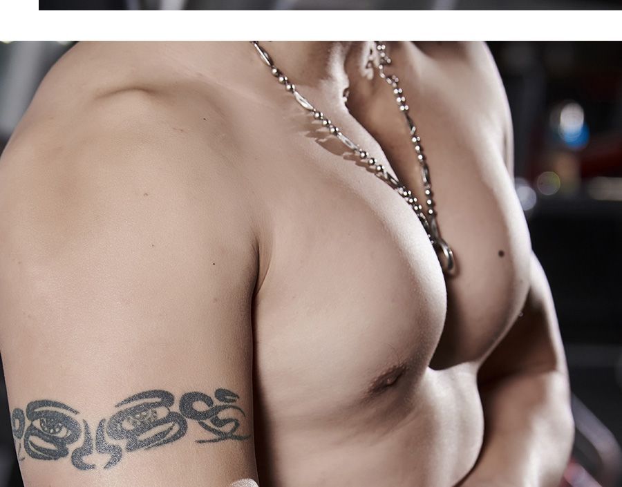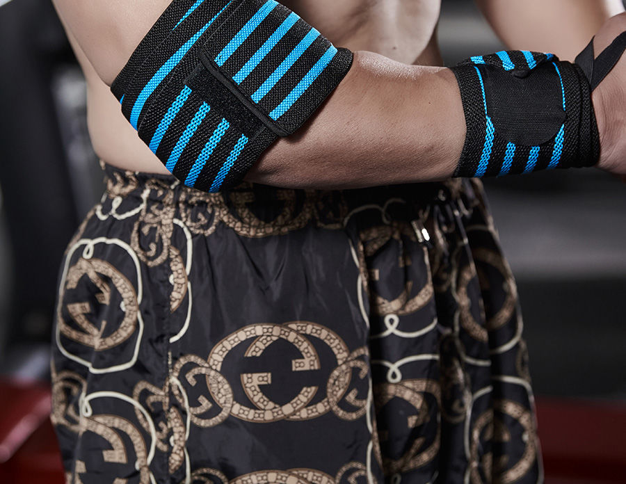 肘を巻いて加圧フィットネスの重量挙げをします。