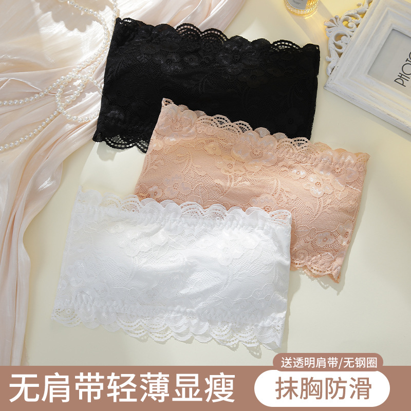 セクシーなレースのブラジャー、ストラップレス、美しい背中、露出防止ボトムチューブトップ下着、胸パッドと滑り止め付き女性用