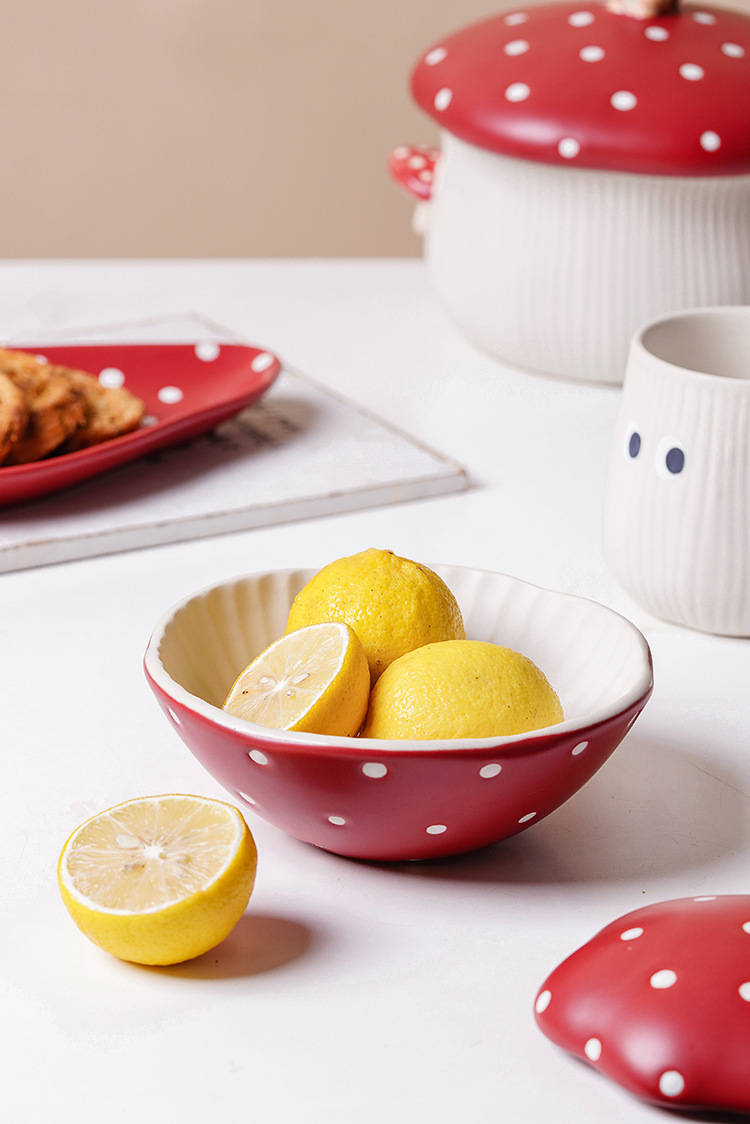 見栄えの良いかわいい赤いキノコの陶器食器、マグカップ、スナックプレート、丼、インスタントラーメンボウル、サラダボウル、スプーン