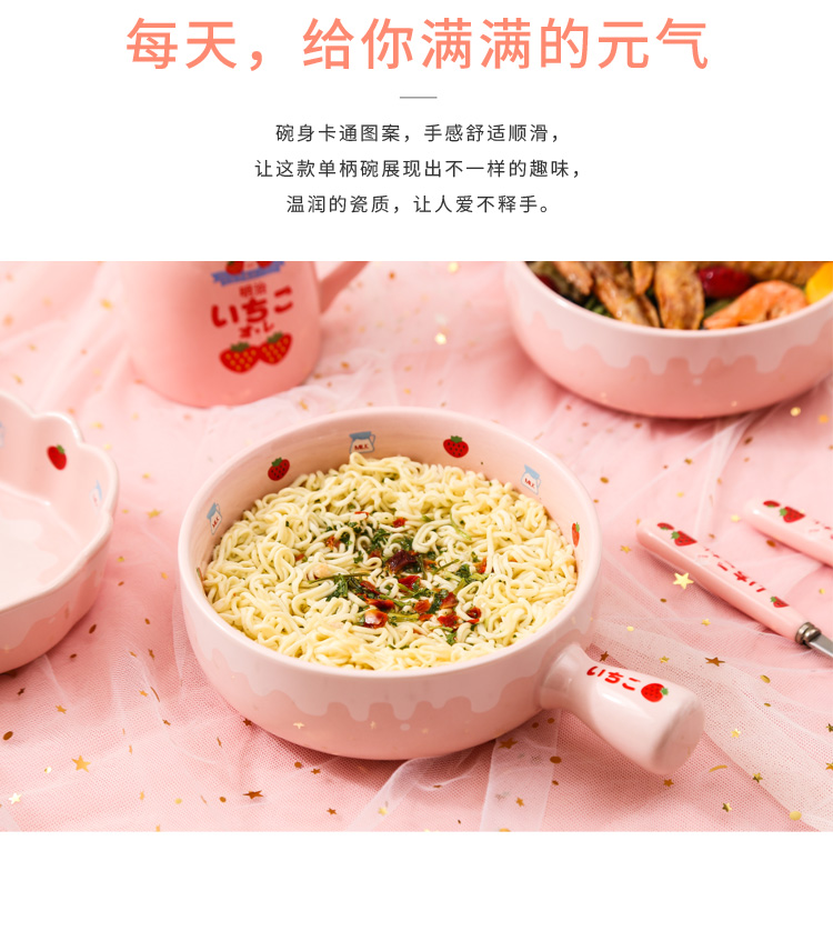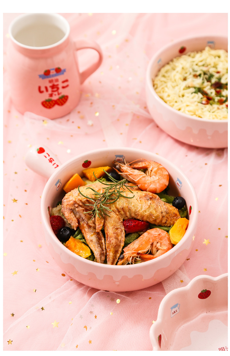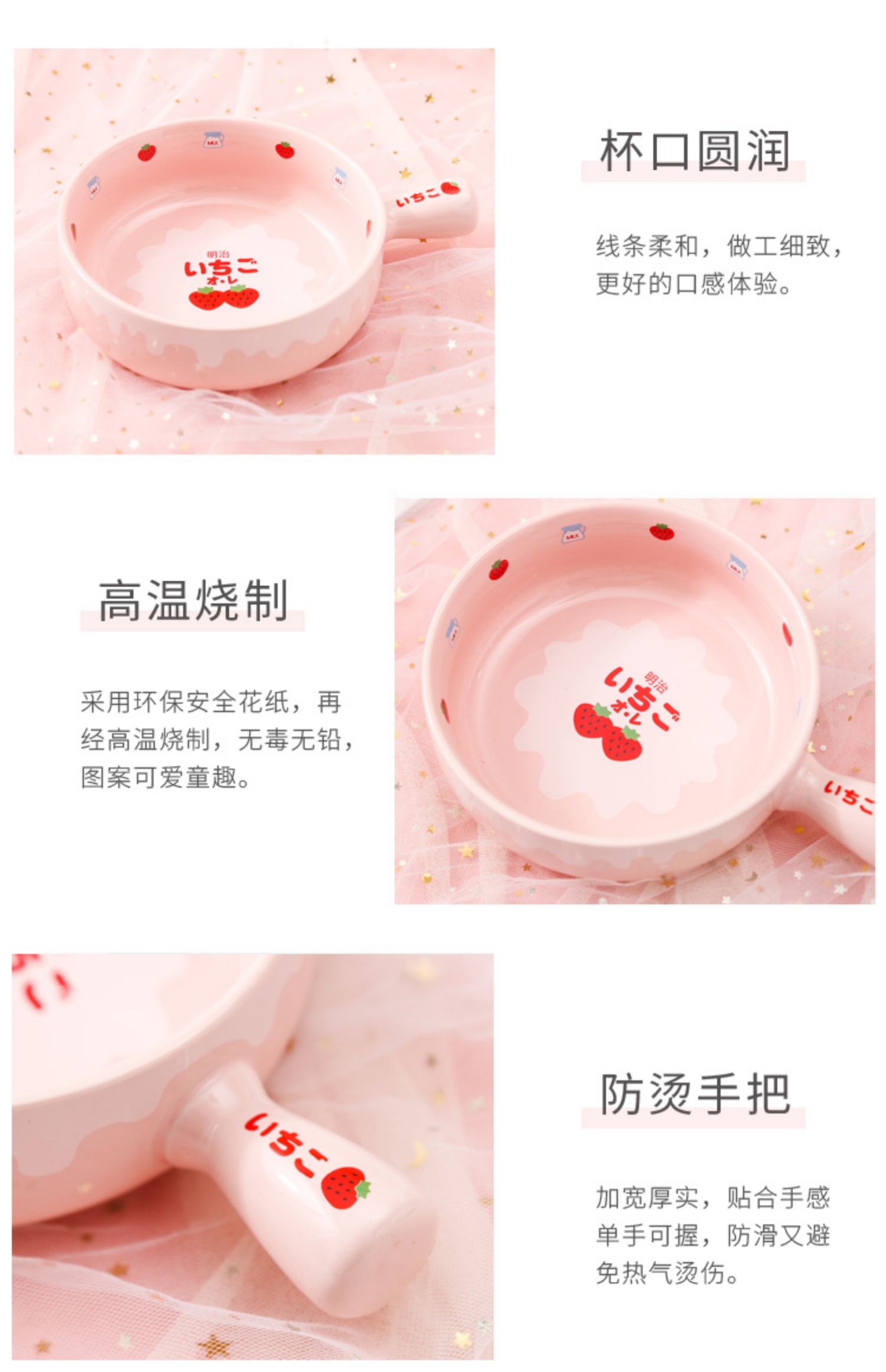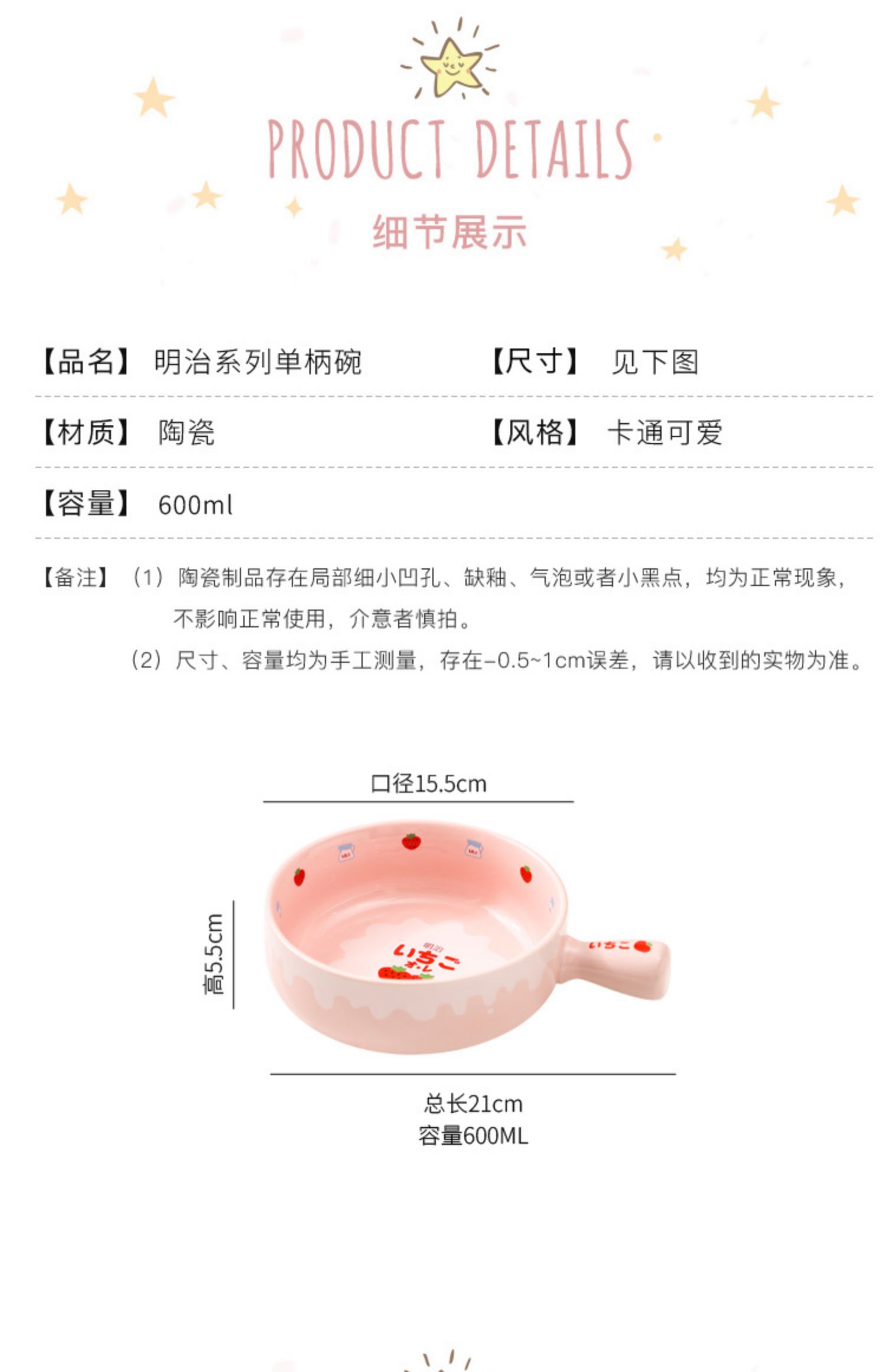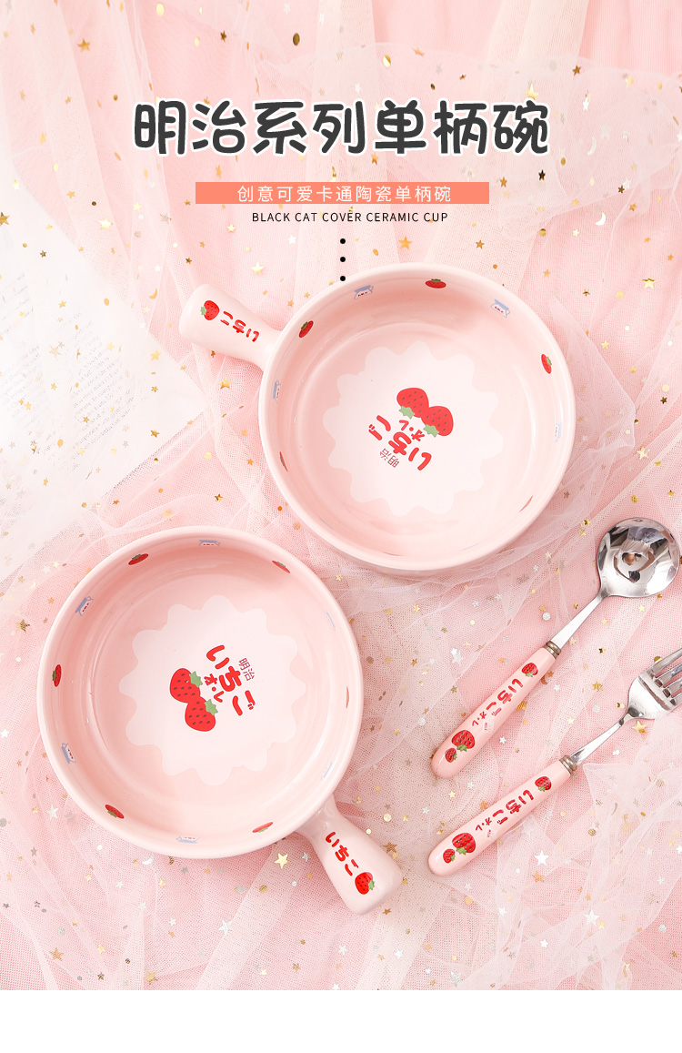 9worピンク明治イチゴ可爱い少女セラミック泡麺ボウルハンドル付き家庭用焼きボウル学生シリアルボウル砂