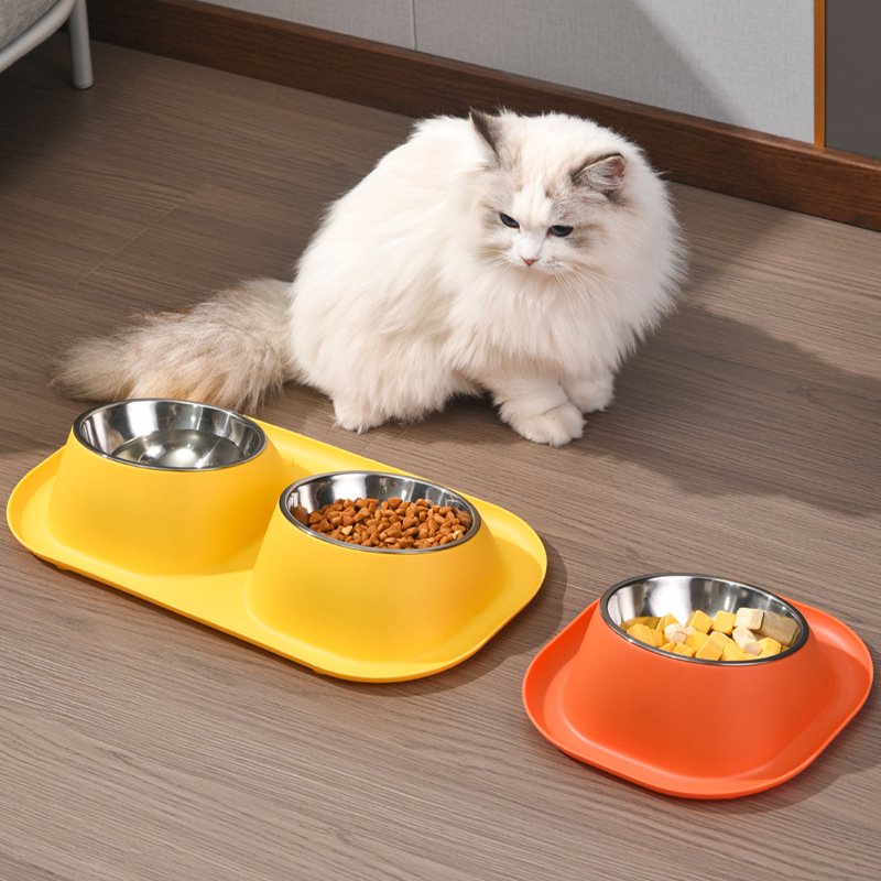 工場直販ステンレス製犬猫ボウル、ペットボウル、斜め口給餌、キャンディーカラーのダブルボウル、飲料水、首の保護、漏れ防止