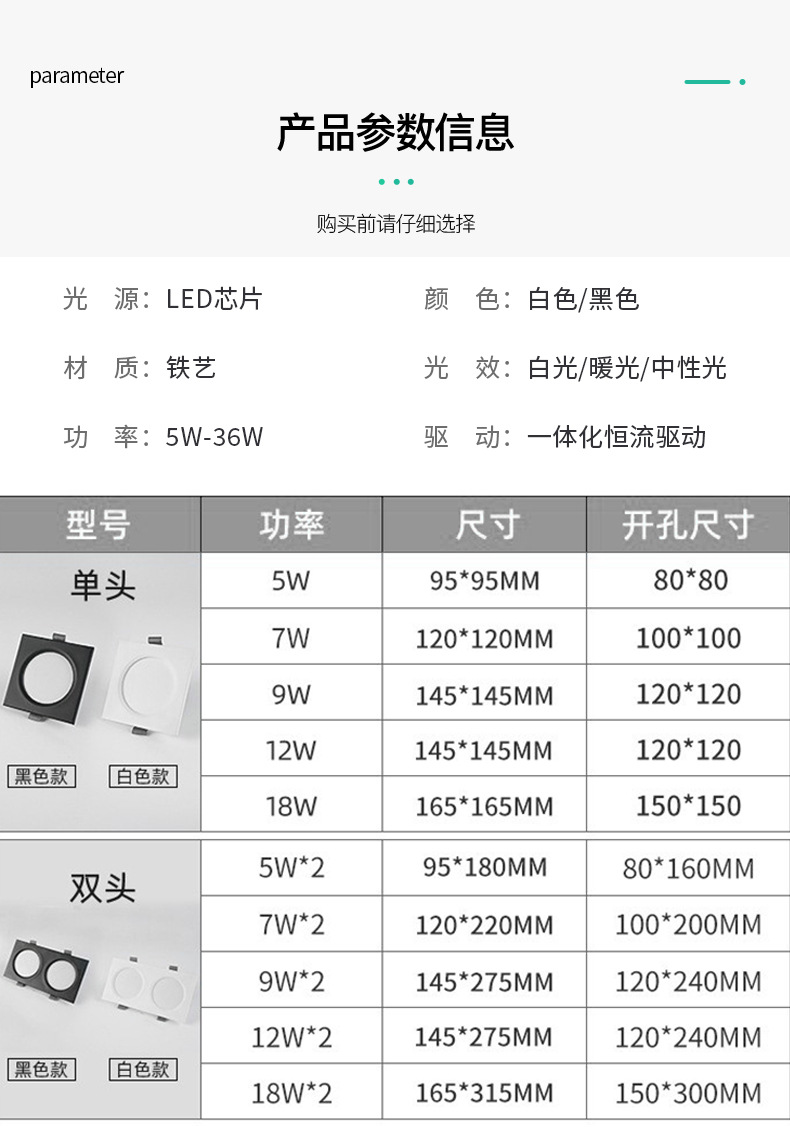 シングルヘッドホワイトシェル 5w サイズ 95*95mm 開口部 80*80mm,シングルヘッドブラックシェル 5w サイズ 95*95mm 開口部 80*80mm,シングルヘッドホワイトシェル 7w サイズ 120*120mm 開口部 100*100mm,シングルヘッドブラックシェル 7w サイズ 120*120mm 開口部 100*100mm,シングルヘッドホワイトシェル 12w サイズ 145*145mm 開口部 120*120mm,シングルヘッドブラックシェル 12 ワットサイズ 145*145 ミリメートル開口部 120*120 ミリメートル,シングルヘッドホワイトシェル 18w サイズ 165*165mm 開口部 150*150mm,シングルヘッドブラックシェル 18w サイズ 165*165mm 開口部 150*150mm,双頭ホワイトシェル 5w*66.6cm インチ 95*180mm 開口部 80*160mm,ダブルヘッドブラックシェル 5w*66.6cm インチ 95*180mm 開口部 80*160mm,双頭ホワイトシェル 7w*66.6cm インチ 120*220mm 開口部 100*200mm,ダブルヘッドブラックシェル 7w*66.6cm インチ 120*220mm 開口部 100*200mm,ダブルヘッドホワイトシェル 12w*66.6cm インチ 145*275 ミリメートル開口部 120*240 ミリメートル,ダブルヘッドブラックシェル 12w*66.6cm インチ 145*275 ミリメートル開口部 120*240 ミリメートル,ダブルヘッドホワイトシェル 18w*66.6cm インチ 165*315mm 開口部 150*300mm,ダブルヘッドブラックシェル 18w*66.6cm インチ 165*315 ミリメートル開口部 150*300 ミリメートル