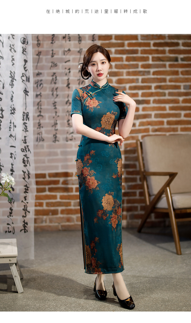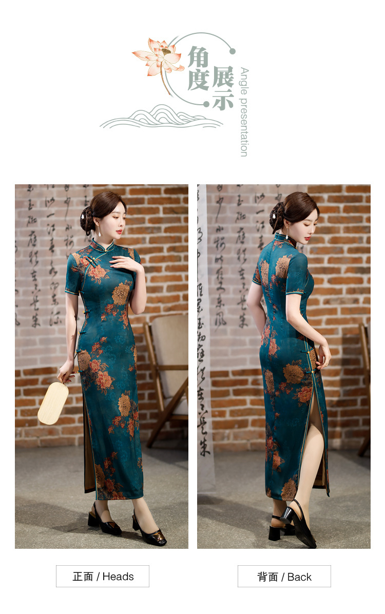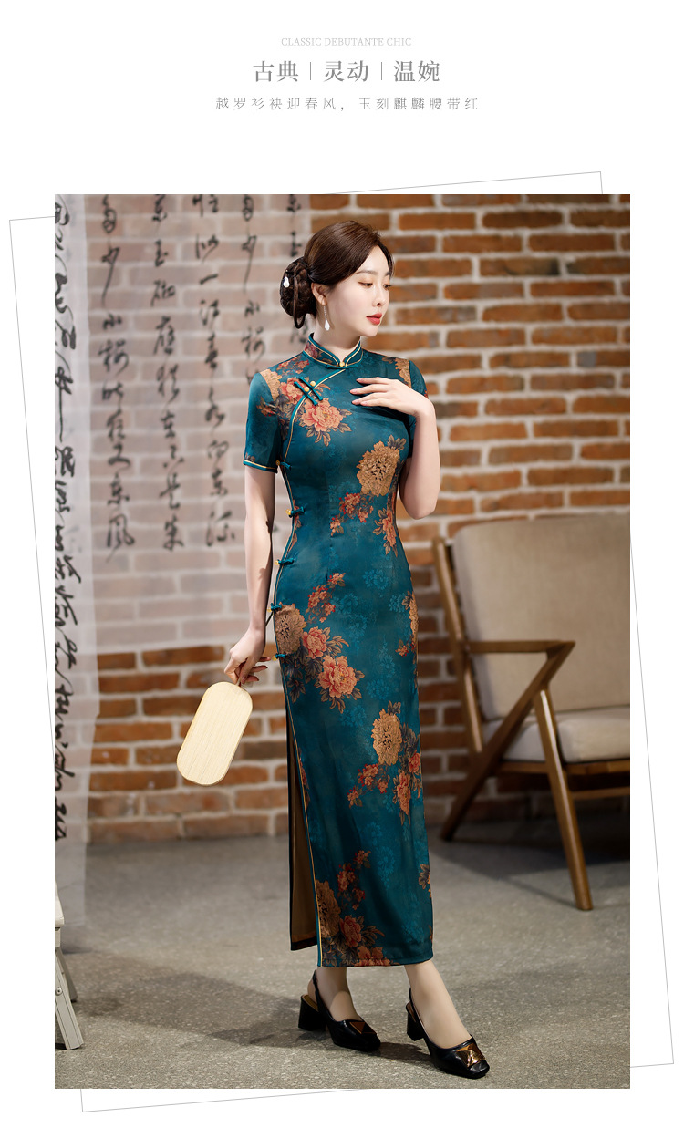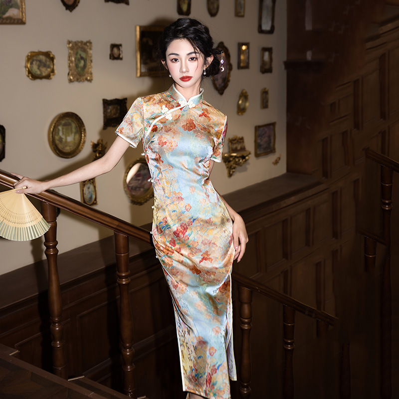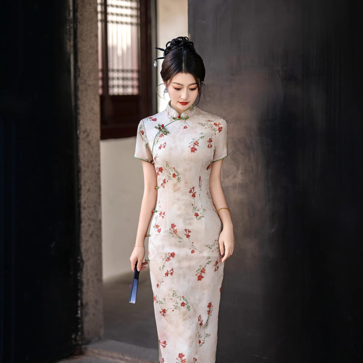 シルク調ロングチャイナドレス 2025春新作 文芸風 レトロ 中国風 宴会 キャットウォーク チャイナドレスワンピース