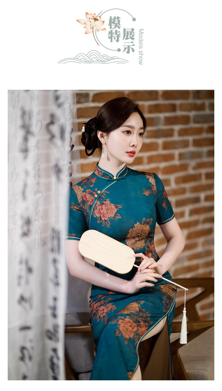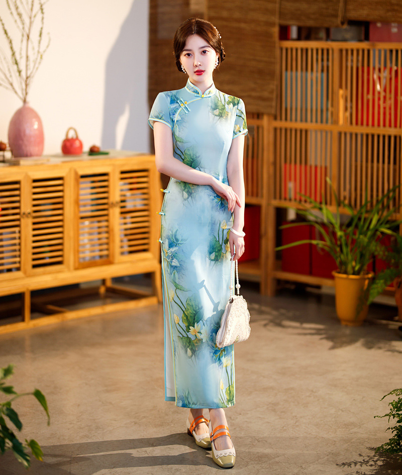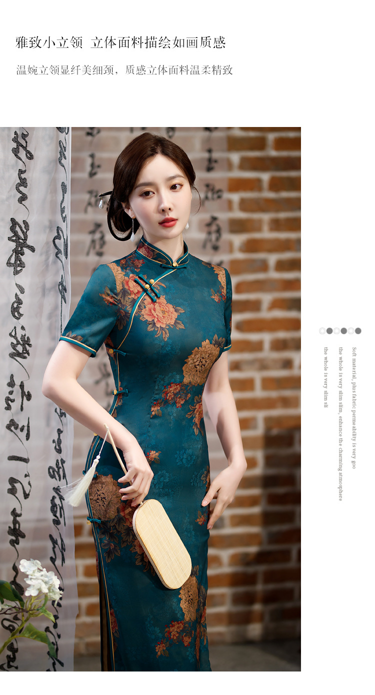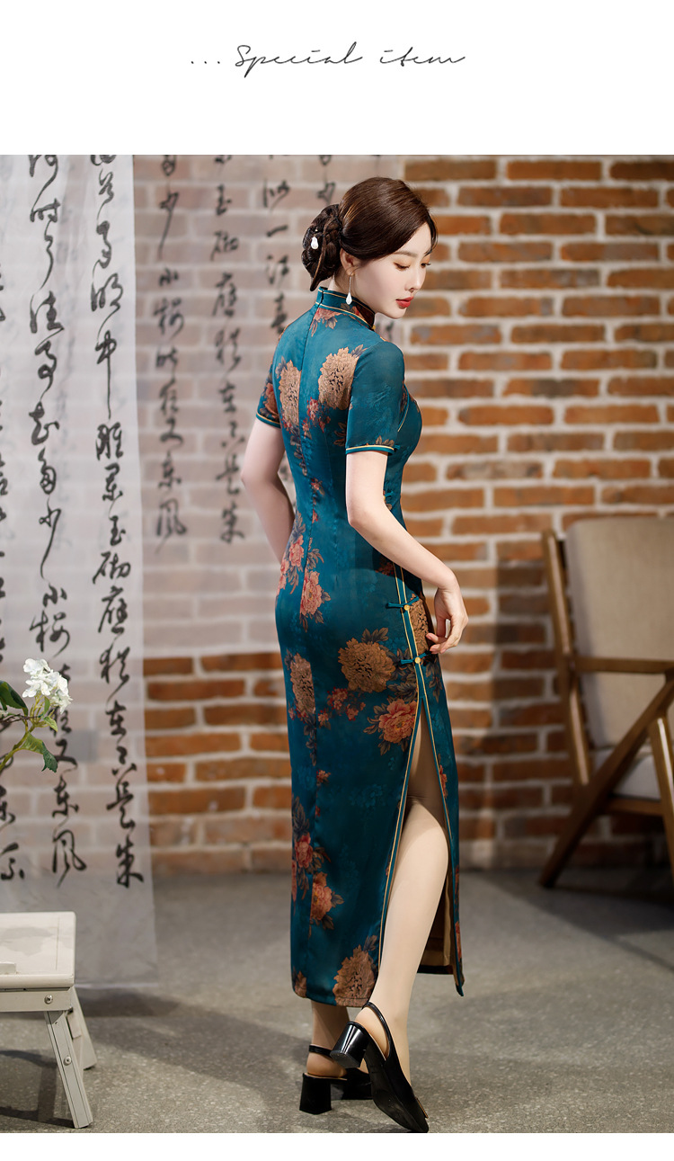 シルク調ロングチャイナドレス 2025春新作 文芸風 レトロ 中国風 宴会 キャットウォーク チャイナドレスワンピース