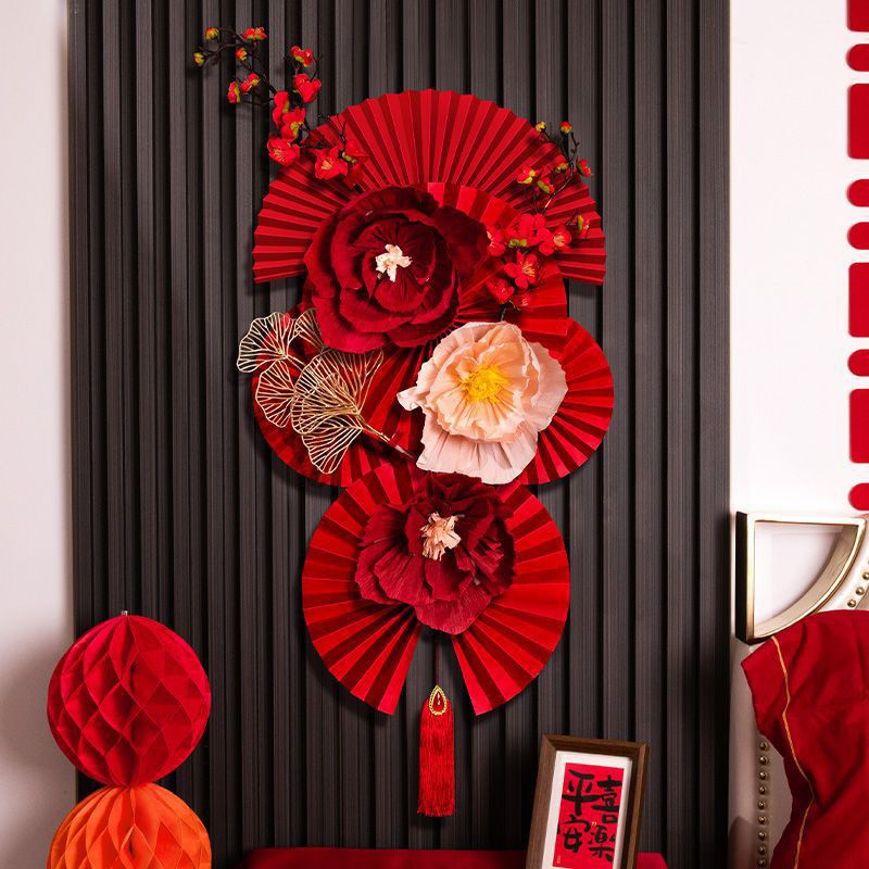 結婚部屋の配置セット結婚した新しい部屋の男性のリビングルームの背景壁に花を引く結婚式の女性の寝室の紙扇の花の装飾