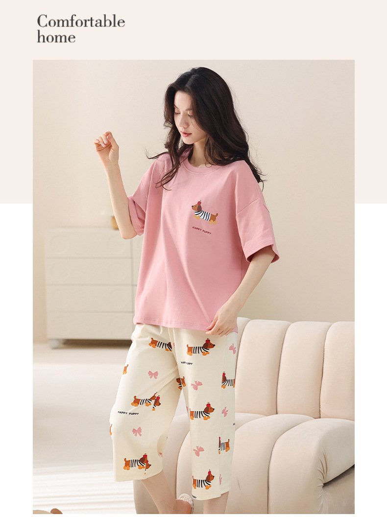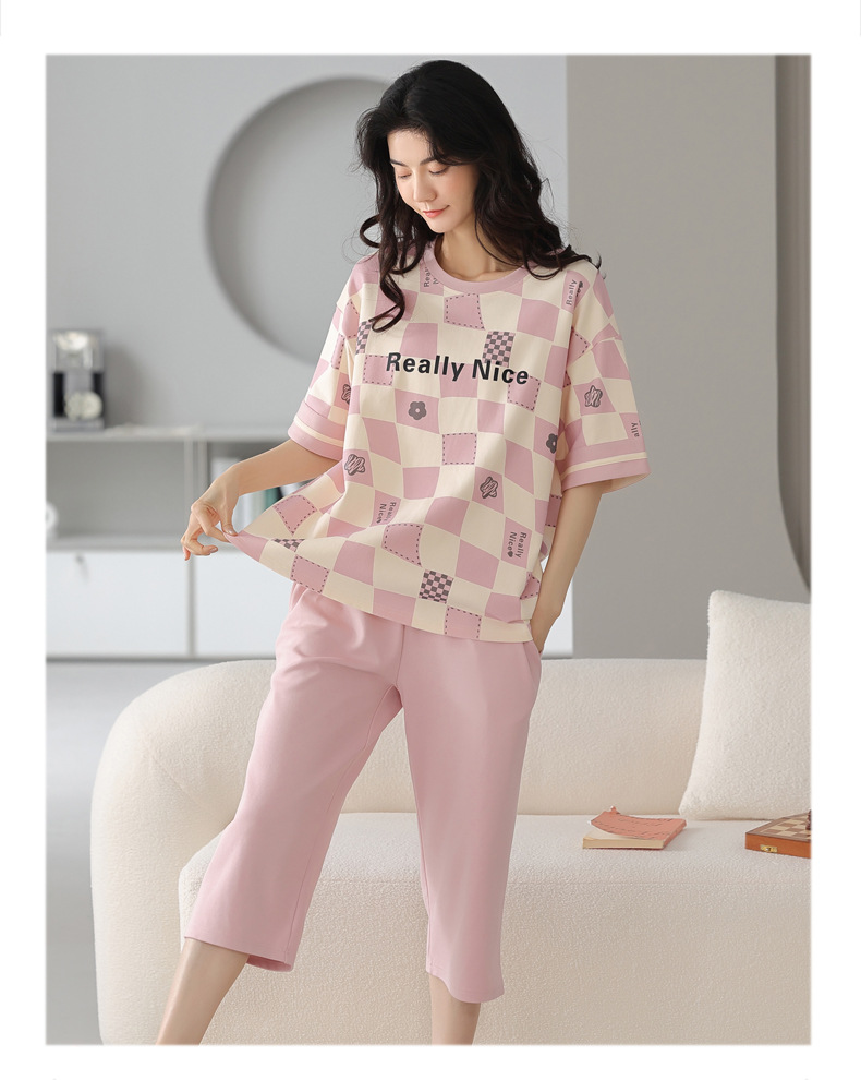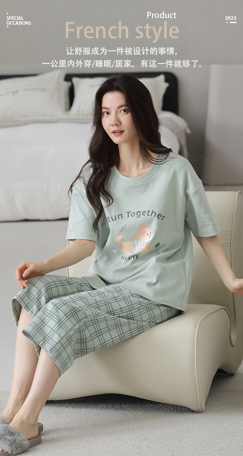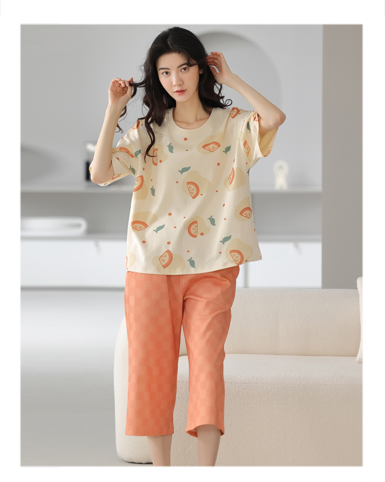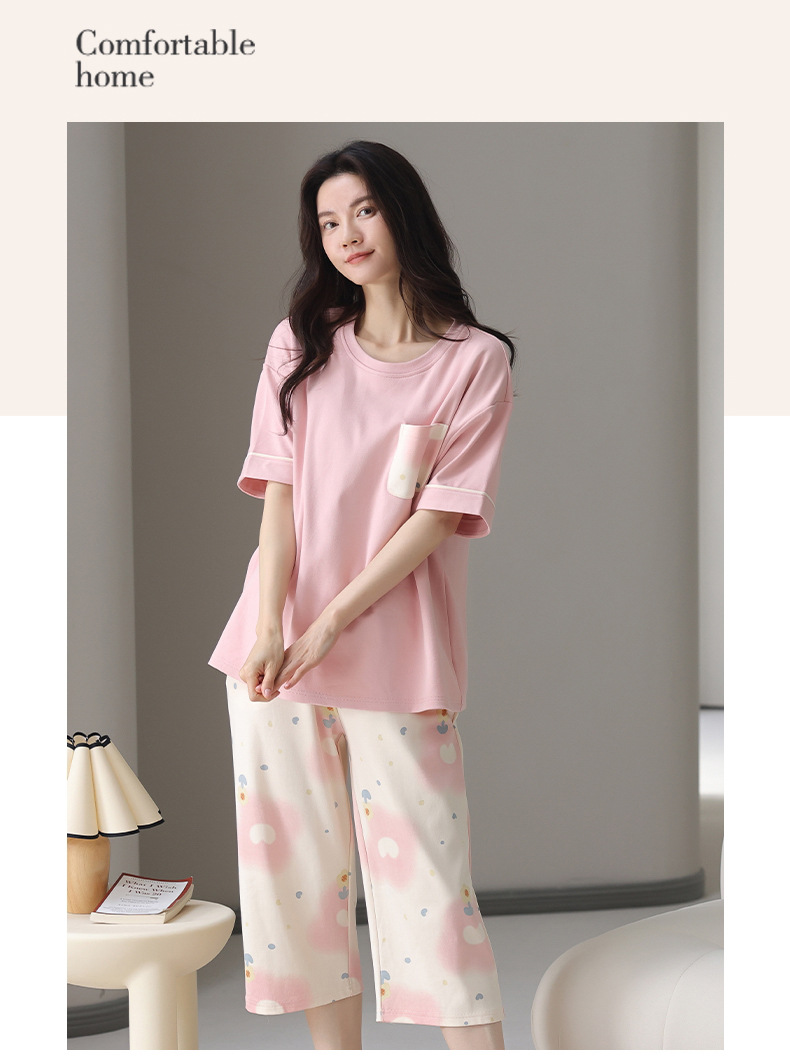 夏用レディースパジャマ、純綿半袖長ズボン、ラウンドネック、プルオーバー、大きいサイズ、人気ホームウェアセット、越境販売専用