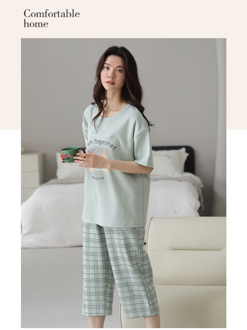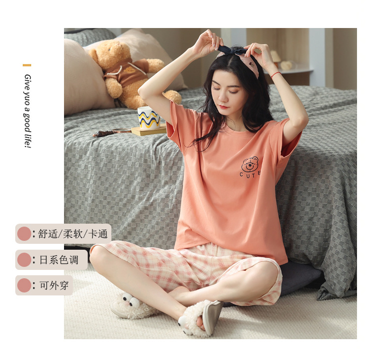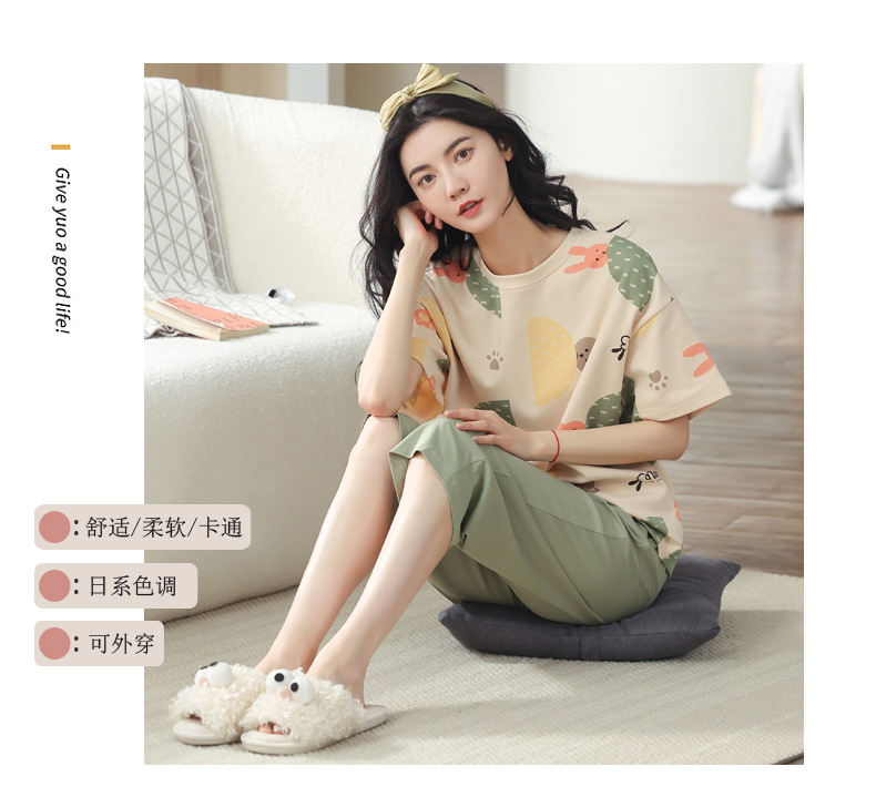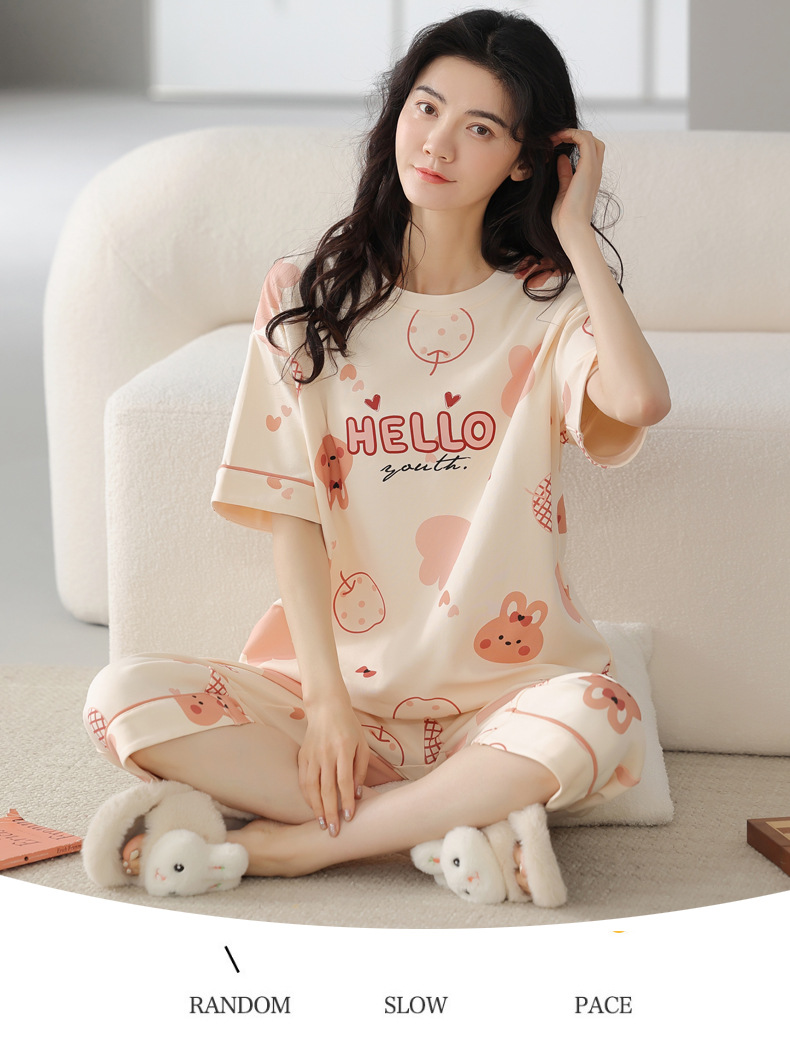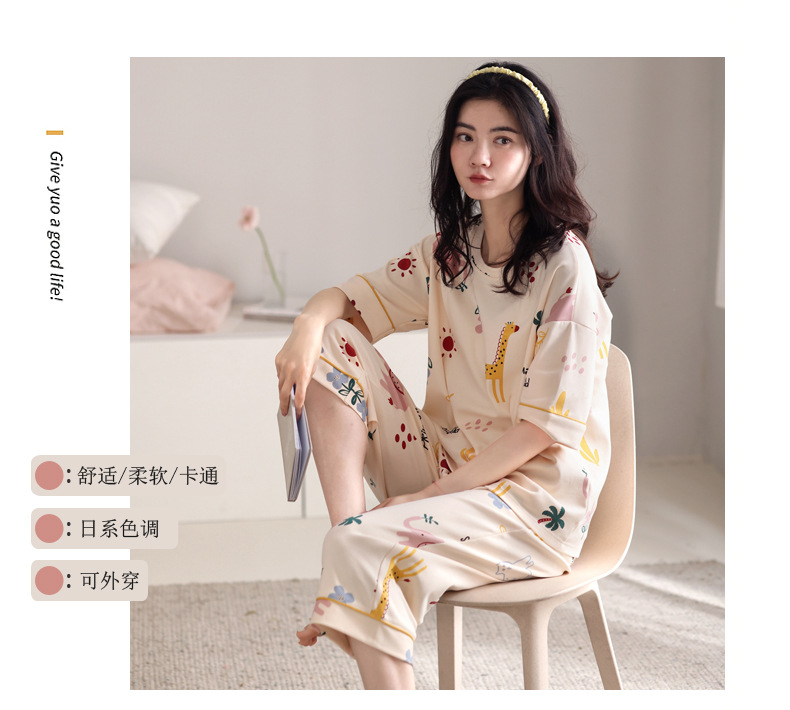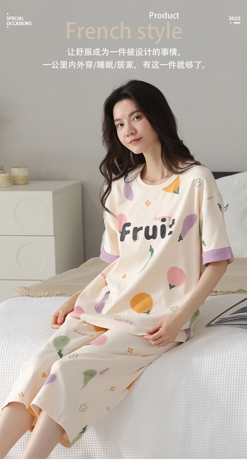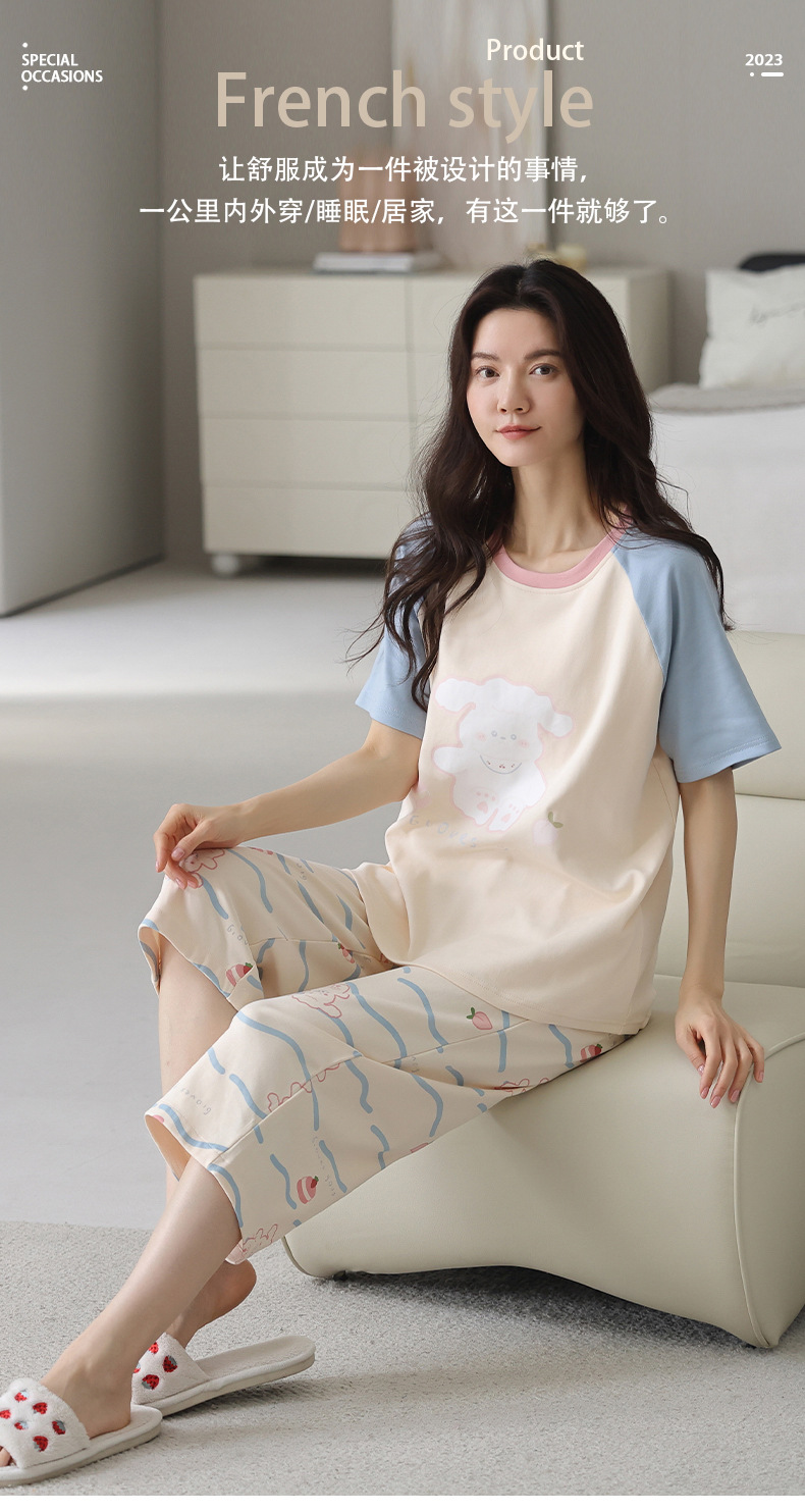 新しいパジャマの女性の夏の純綿の半袖の7分のズボンのかわいいレジャーは家庭服のスーツを着ることができます。