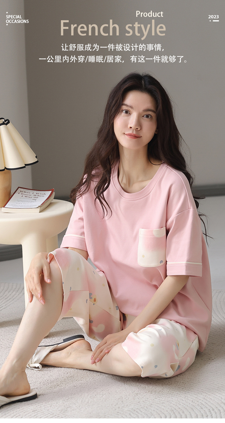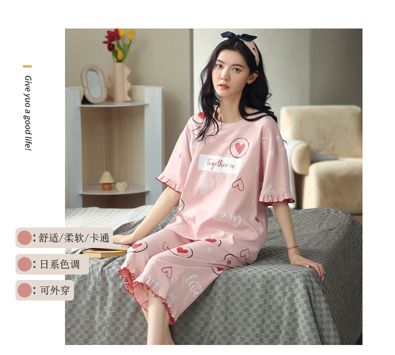 パジャマ女性夏純綿夏新作半袖七分丈ズボン韓国版カジュアル可愛いアウターホームウェアレディース