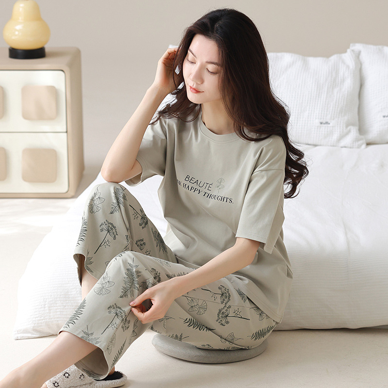 100% 純綿パジャマ女性夏半袖長ズボンカバーゆるい大サイズ綿快適カジュアルホームウェア