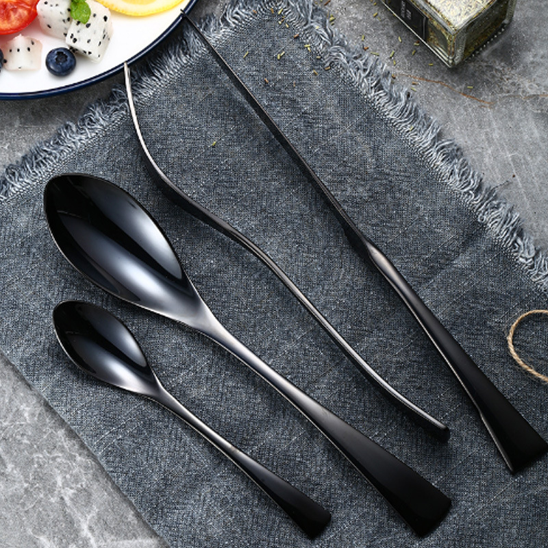ホテルのレストランは厚いステーキナイフのフォークスプーンセットの黒い柄のメーカーが大量に卸売りします。
