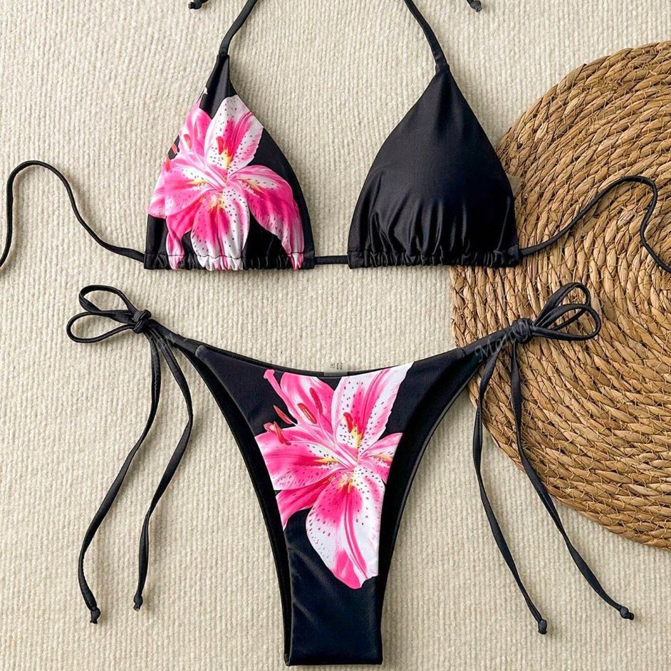 2025 新しいホルターネックセクシーなヨーロッパとアメリカのファッションスプリットビキニフラワープリント水着女性ビキニクロスボーダー