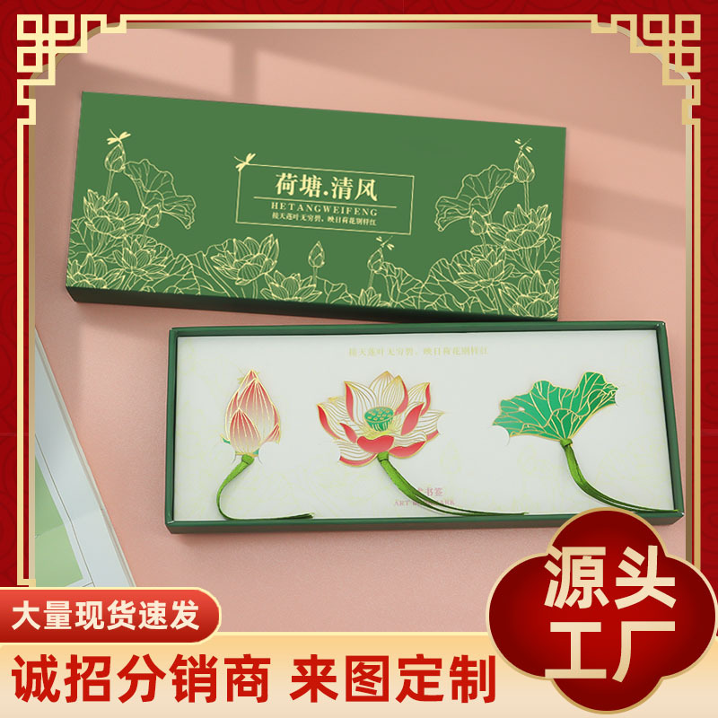 クリエイティブな蓮の花の金属製ブックマークギフトボックス入り、中国風真鍮ブックマーク、文化的で創造的なギフト、古代風腐食ブックマーク卸売