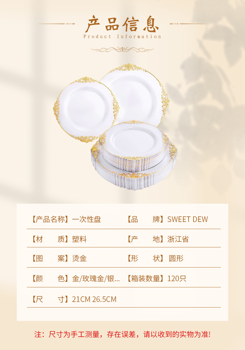 透明金色塑料盘 - 花式蕾丝边缘透明盘带金色饰边锤锻一次性餐盘