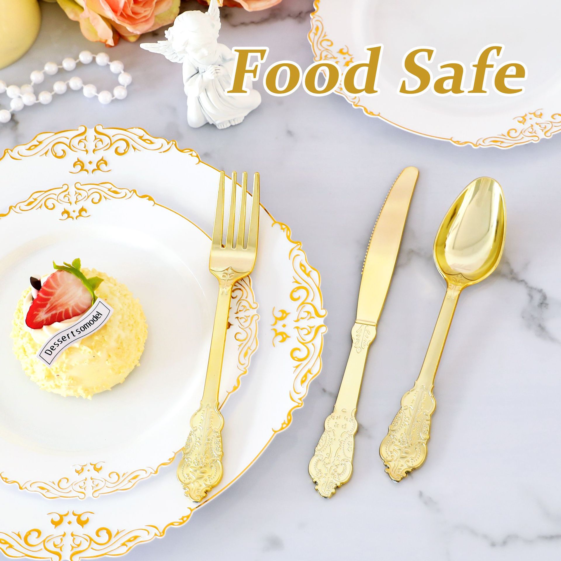 跨境热销复古浮雕金色一次性塑料刀叉勺生日派对婚庆餐具厂家现货