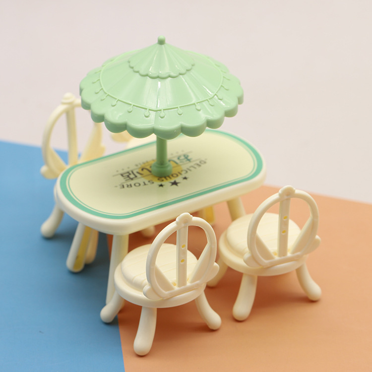 ままごとのミニ家具の甘い店のレストランの屋外の日除けの傘のテーブルと椅子の模型は子供のおもちゃのプレゼントを並べます。
