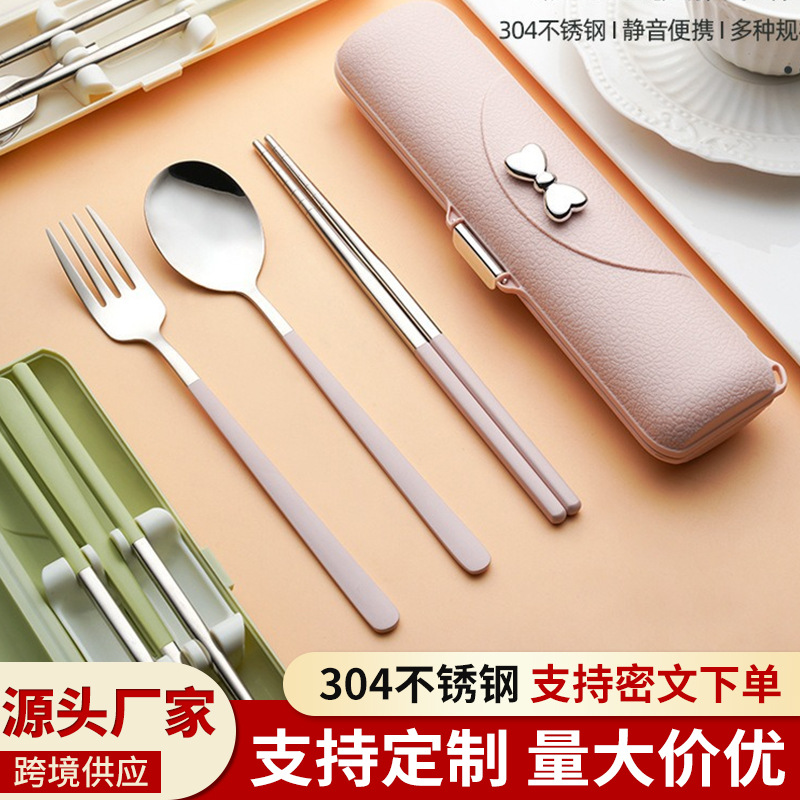 卸売り304ステンレススプーンフォーク箸蝶ネクタイ皮紋箱セット携帯食器屋外学生ギフトボックス