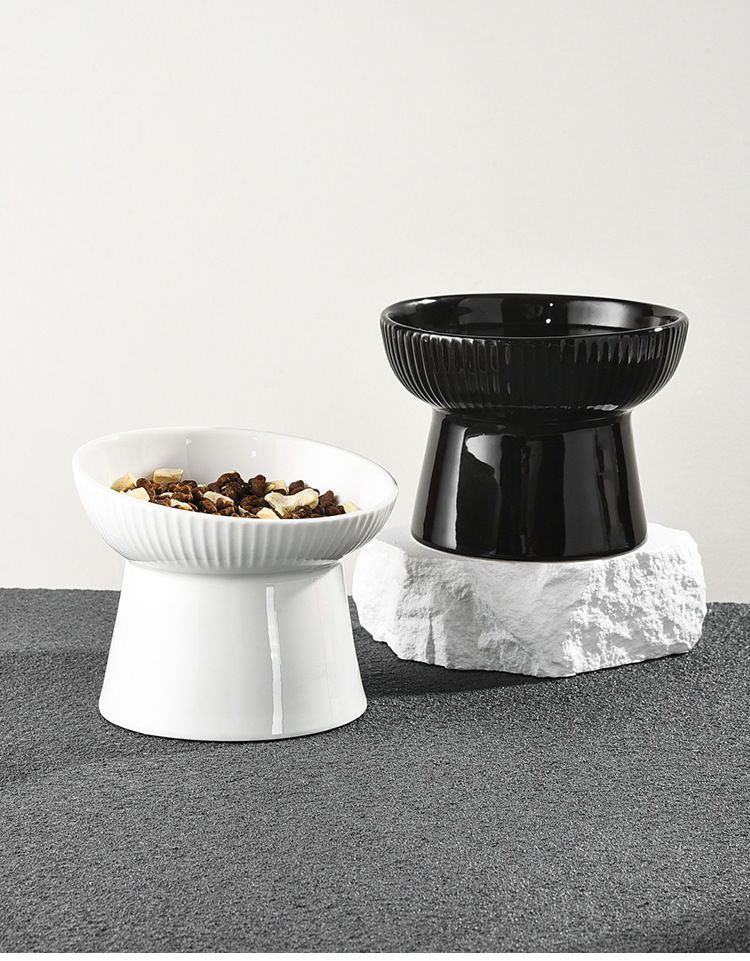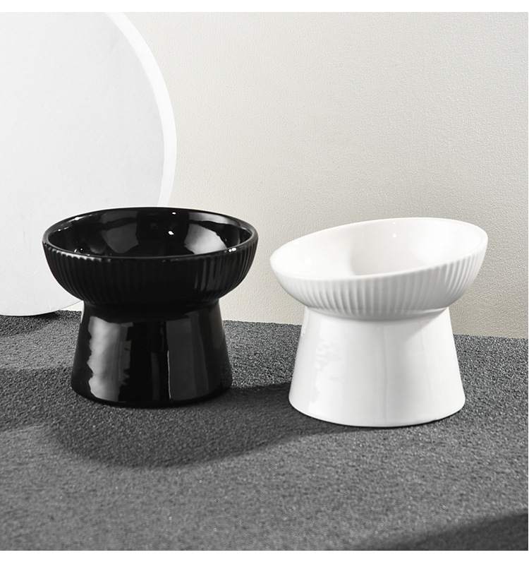 猫の碗の陶磁器の猫の食器の高い足の斜めの口の保護の首は黒のあごの猫の茶碗を防ぎます。