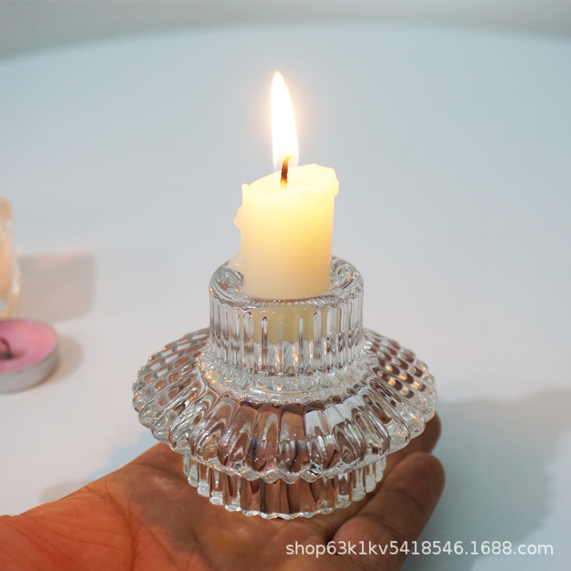 透明なキャンドルベースのキャンドル台ロマンチックなキャンドルディナーの燭台はガラスの小さな燭台を抑えて道具を撮影します。