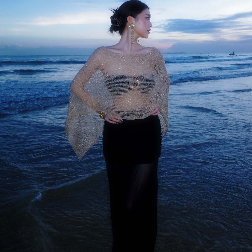 水半SHUIBAN鎏金岁月金色针织罩衫镂空上衣比基尼三件套披肩多穿