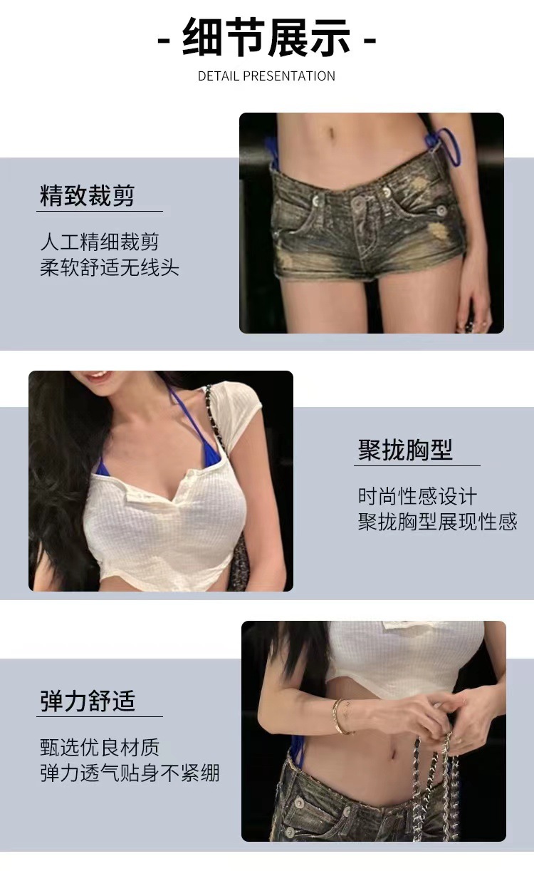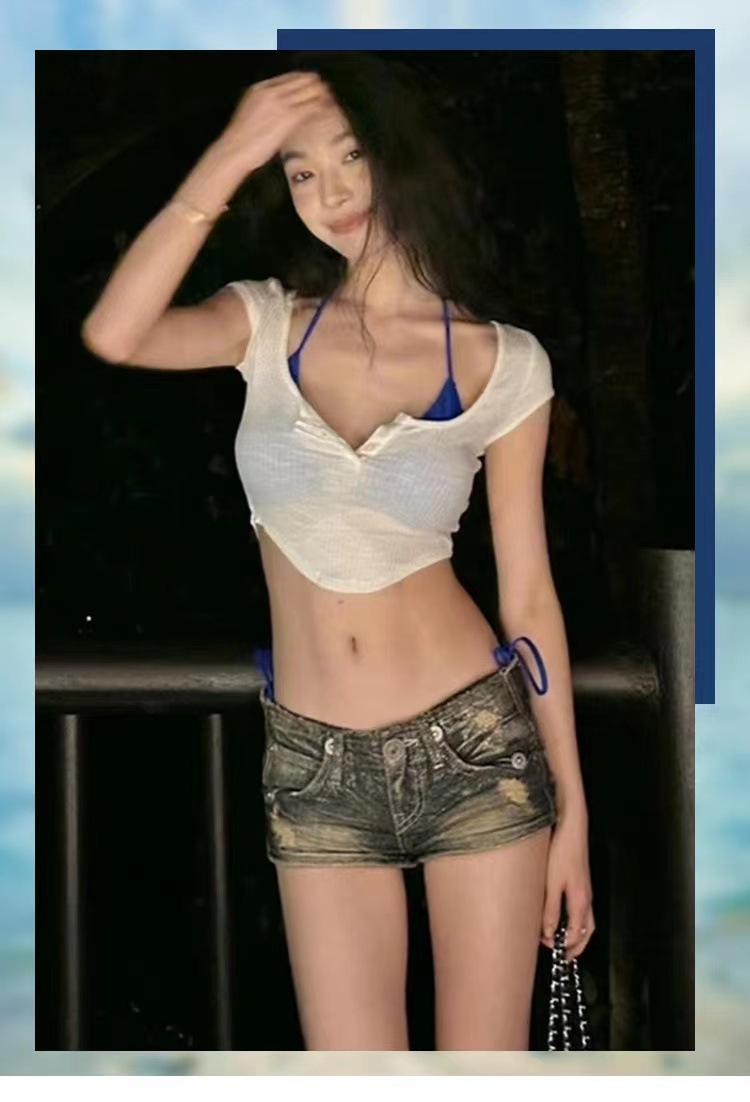 イ・メンリンと同じスタイルのボタン付き半袖ブラウス、クラインブルーのビキニ、ホルターネック、プッシュアップ、ビーチ、リゾート、水着、背中開き