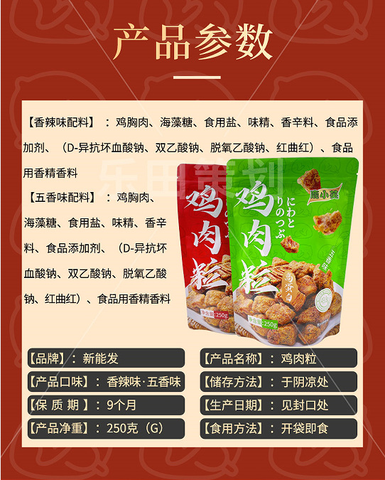 パッケージ仕様 高蛋白鶏肉の粒の五香の味は半斤です。,高蛋白鶏肉の粒の辛味は半斤です。,高蛋白鶏肉の粒五香1斤入り,高蛋白鶏肉の粒の辛味は一斤です。