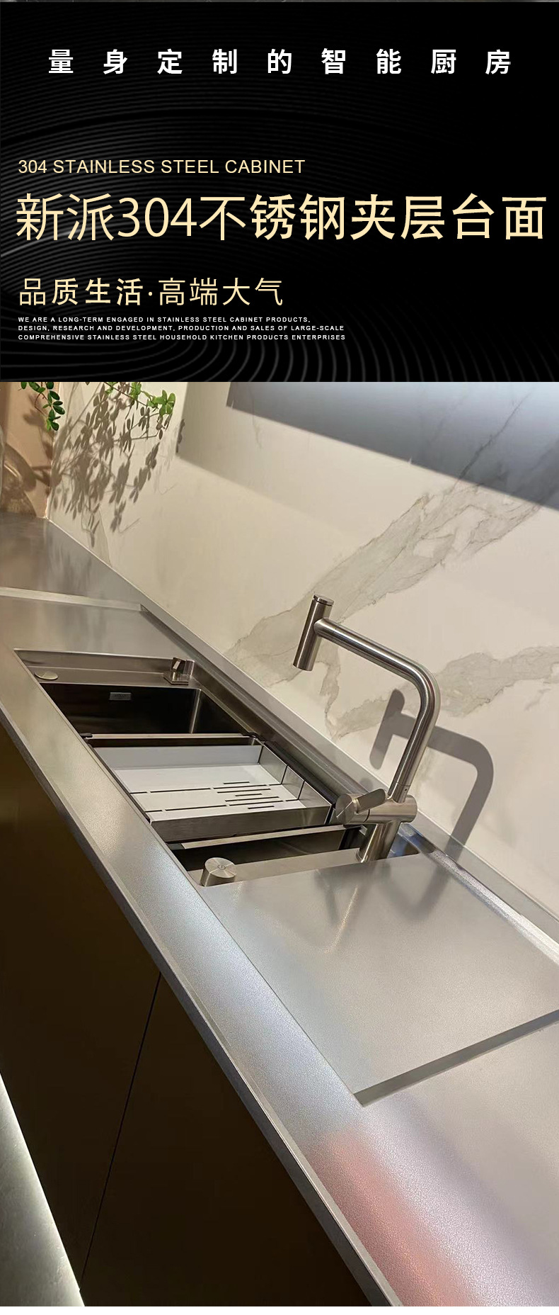 304不锈钢防刮花实心台面橱柜桌面水槽一体成型加工岛台