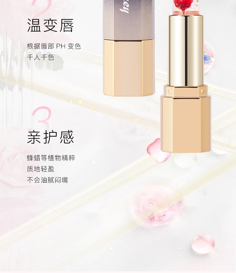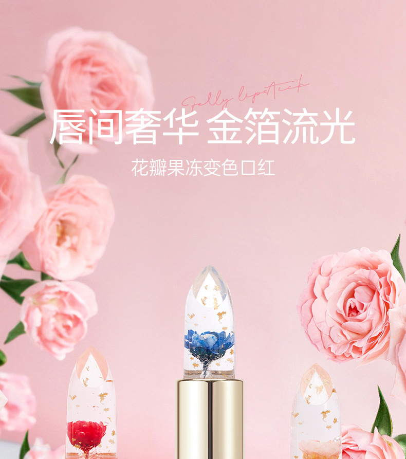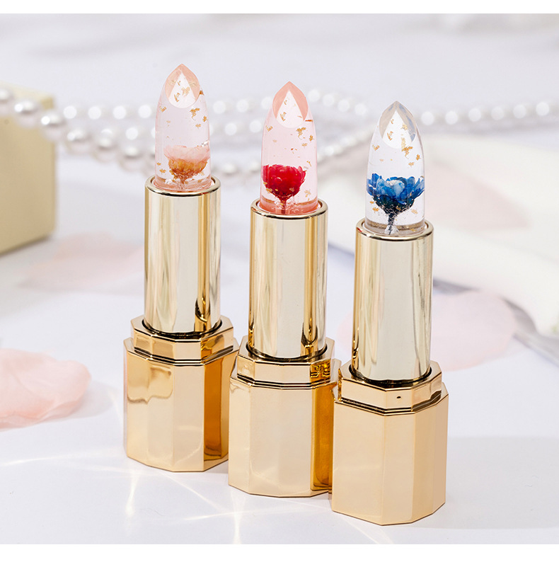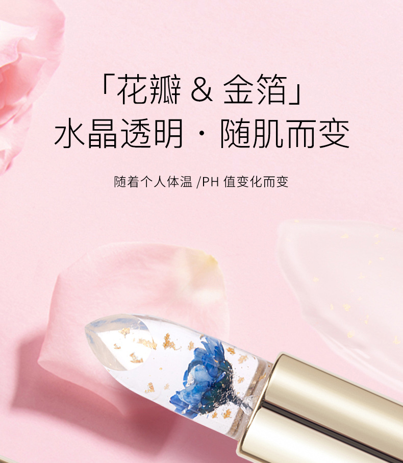 花びらの花の口紅透明ゼリーの変色金箔の温変リップクリームはコップをつけないで色を落とさないで潤いがあります。