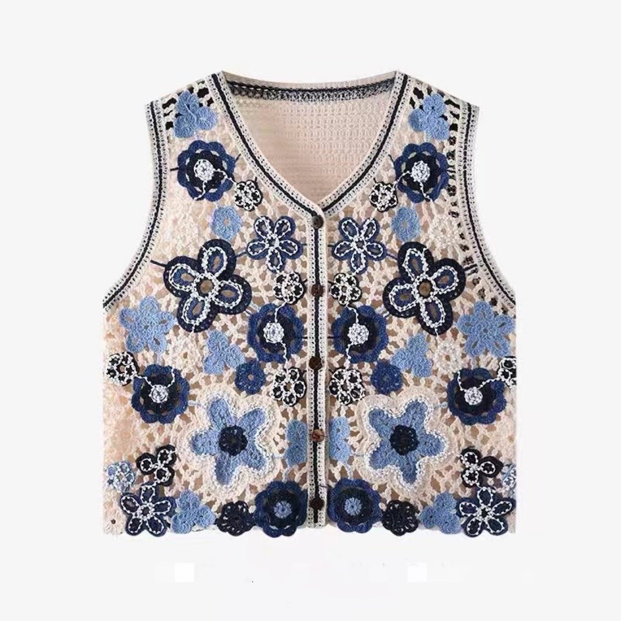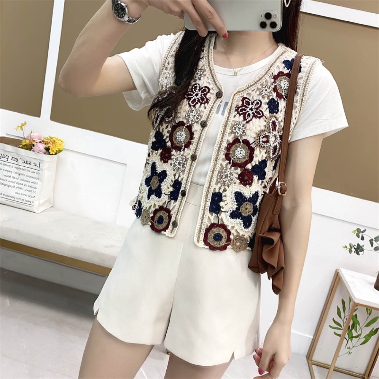 民族風のビーズのフックの花のニットのベストの女性の春夏の透かし彫りの薄いタイプの単列はカーディガンを掛けて外に着ます。