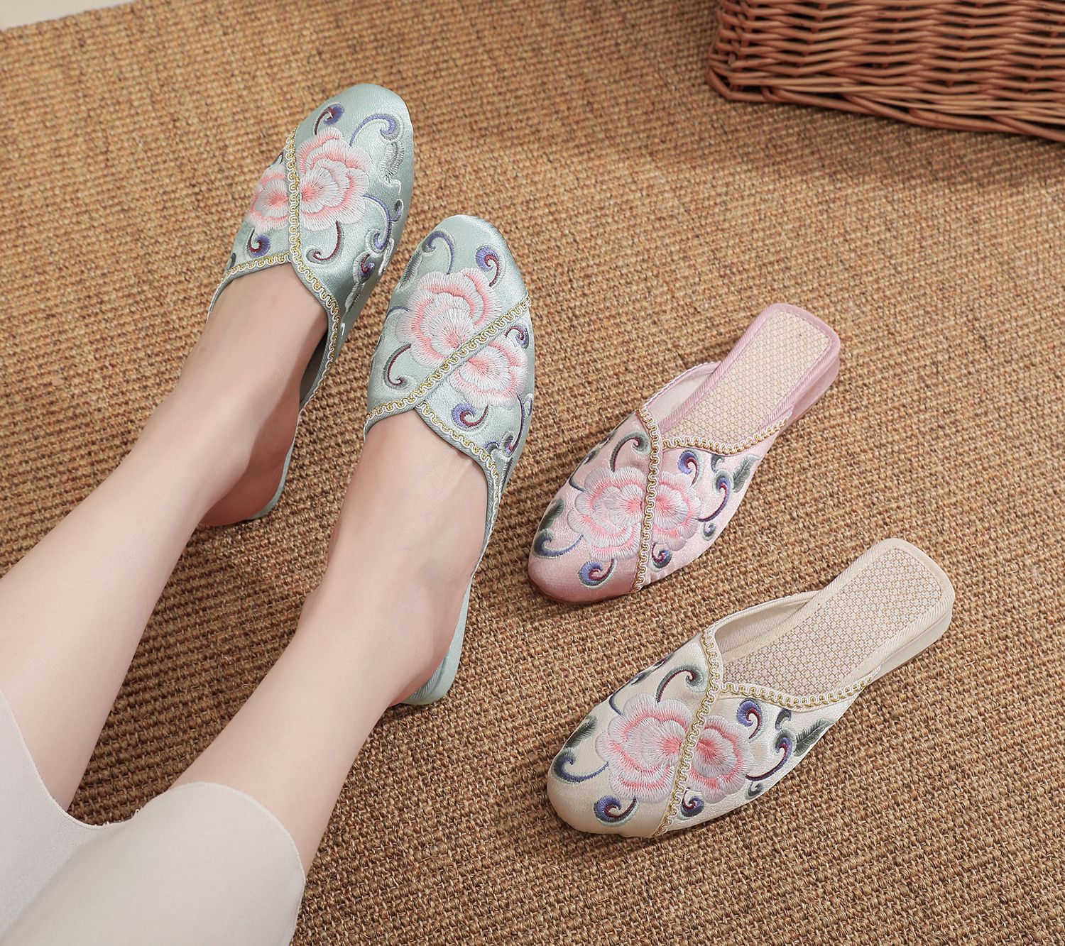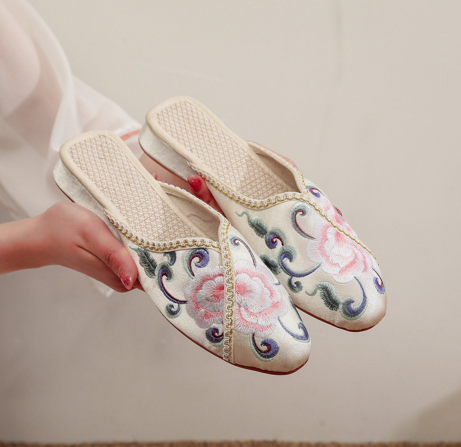 【煙柳】2025夏の新型北京布靴古風チャイナドレス包頭スリッパソフト底レトロ刺繍靴