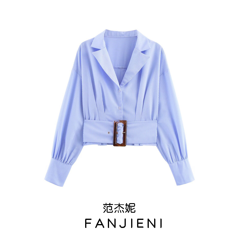 ZR外贸批发 欧美风女装 时尚气质百搭条纹配腰带收腰翻领长袖衬衫