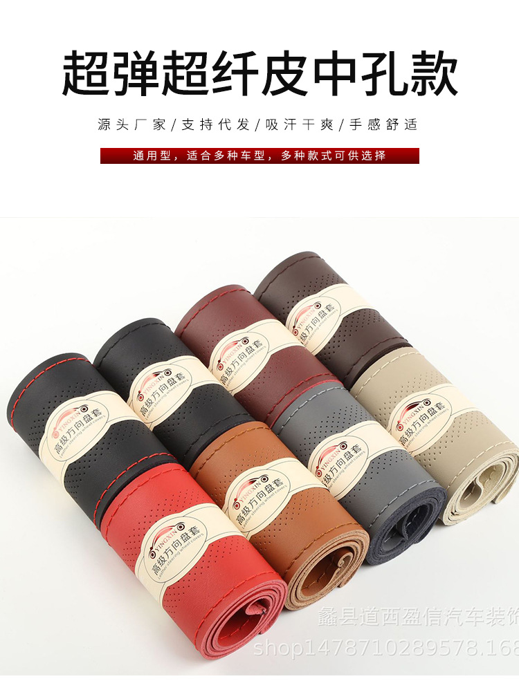 国境を越えた肌の感触のマイクロファイバーレザーハンドルカバー工場卸売超薄型吸汗性ハンドルカバーエンボス加工スポーツ手縫いステアリングホイールカバー