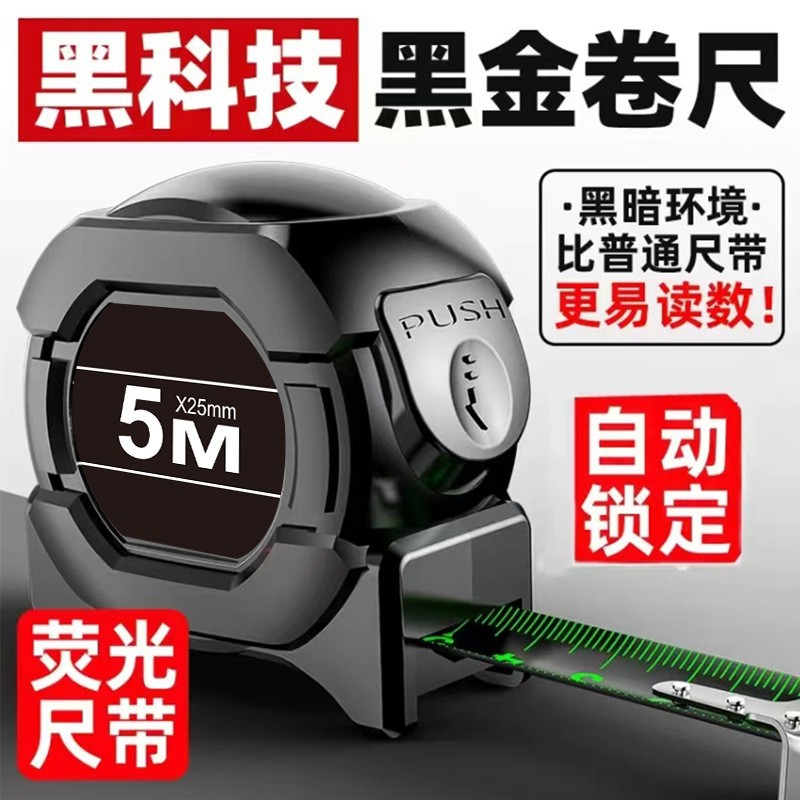 5Mブラックテクノロジー蛍光巻尺、耐落下・耐切断・高精度レーザー刻印、厚みのある耐摩耗性ボックス型メジャー