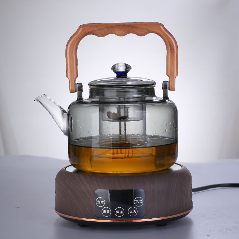 囲炉煮急須提梁壺高ホウ素シリコンガラス急須胡桃木はティーポットを煮る双胆蒸煮一体ティーポットを持っています。